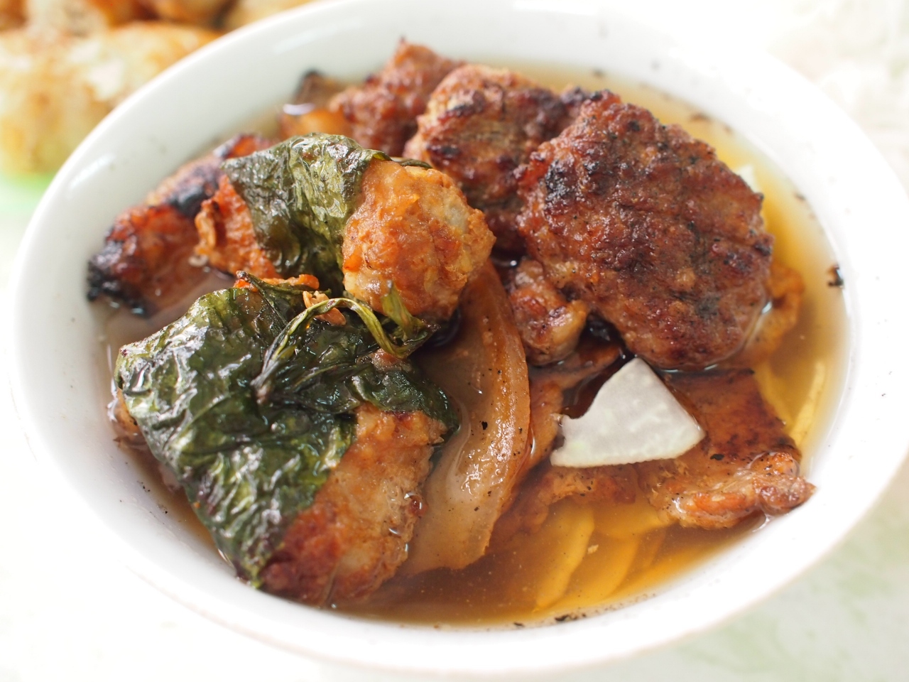 ハンバーグと、豚肉の炭火焼きがつけ汁の中に入っていて、