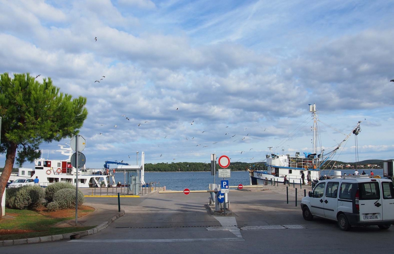 旧市街の北側にあるロヴィニ港の中でも整備された港湾施設がある場所です。フェリーを待つ車と観光客を待つバスが何台か停車していました。ロヴィニ旧市街は狭く駐車スペースが少ないので此処に集まっている気がしました。