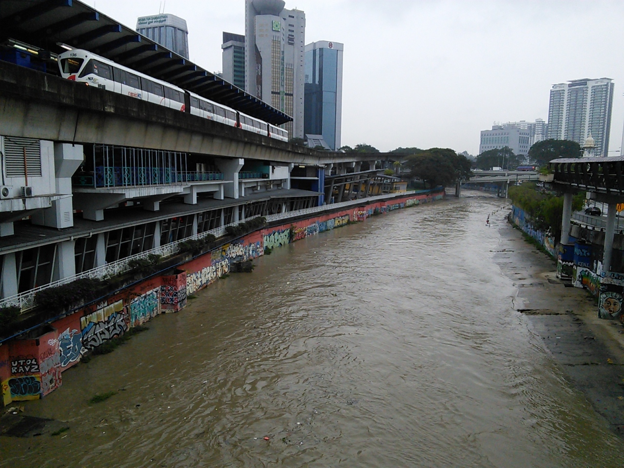 “泥川の交わることろ”。ゴンバック川との合流地点がクアラルンプールの名前の由来にもなった歴史的由緒のある川です。それだけで十分価値はあると思いますが別の楽しみ方もあります。普段は水量も少なく穏やかなドブ川ですがスコール後には表情が一変します。特に合流後の地点、2つ分の川の水が合わさり水かさが増し、なかなか見応えがあります。LRTパサールスニ駅からKTMクアラルンプール駅への連絡通路からなら刻々と水かさが増していく様子もじっくり見れます。わざわざ見にくるものでもないでしょうからたまたま通りかかったら見てみて下さい。