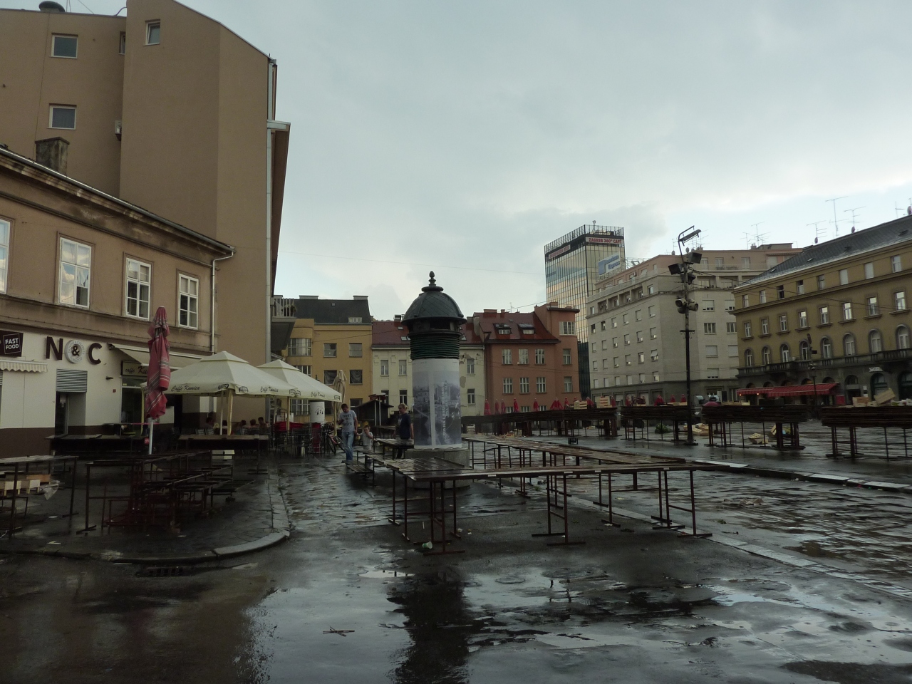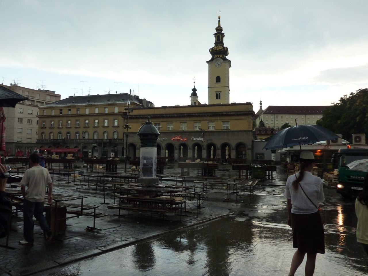 ザグレブの胃袋と言われる青果市場です。大聖堂から少し下った所にあるザグレブで最も古い市場です。石畳の上にテーブルが置かれ、紅いパラソルの下で一が開かれます。但し終了時間は早く、私たちが訪れる直前に大雨が降ったのに加え、夕方になるともう閉まってしまうので店を見る事はできませんでした。