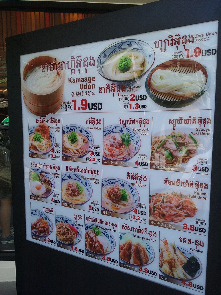 2015年11月丸亀製麺がついにカンボジアに上陸です。メニューはカレーうどんUS$3,肉うどんUS$4,天丼US$4.8とお手頃価格です。プノンペンは平均所得が低い割に、日本人の国にある料理というと以外と高くつくため、丸亀製麺のお手頃だと思います。開店早々、多くのお客さんで大賑わいでした。