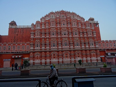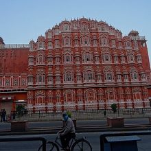 ★INDIAジャイプール「ハワー マハル (風の宮殿) (Hawa Mahal (Palace of Wind))」前の夜にちらっと、ライトアップされたその姿をみたとき、魔法の国に来たのかと思いました。ここはその昔、宮廷の女性たちがここから町を見下ろしたのだそうです。窓が微妙に斜めになっていて、中から外は見えても、外から彼女たちの顔を見ることはできないようになっているそうです。翌朝、朝日のなかで見ると、いかにも風通しがよさそうな窓・・・のみです。薄っぺらな、実に不思議な建物です。