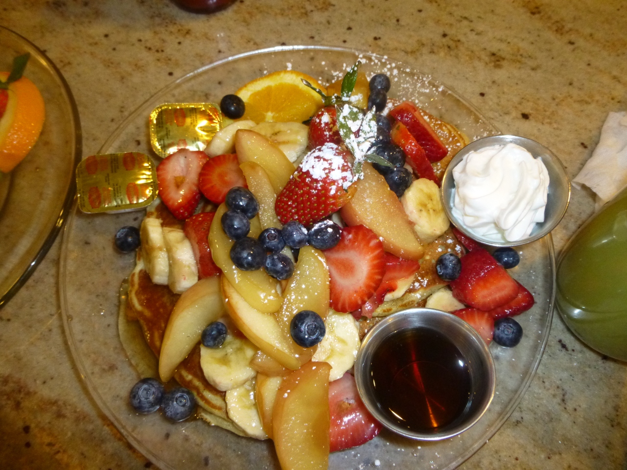 お目当てのパンケーキはフルーツたっぷりでシロップも美味しい!ホイップたっぷりがお好みの方はエッグスンシングスをおすすめします。