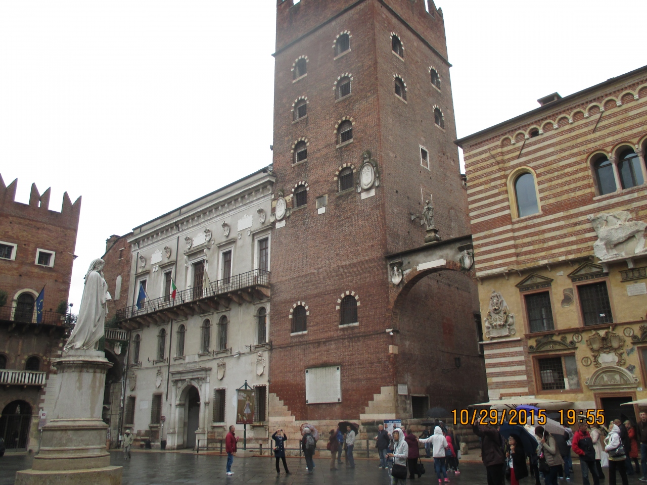 皇帝派のダンテはフィレンツェから追放の身となり、ここヴェローナで亡命生活を送り、『神曲』天国編の2/3を書き上げたのだそうです。この広場は、ランベルティの塔の真下でコンシリオの回廊、カングランデ館、カピターニオ館、ラジオーネ館に囲まれています。カピターニオ館の前には、ローマ時代の石畳というのも遺跡として残っています。