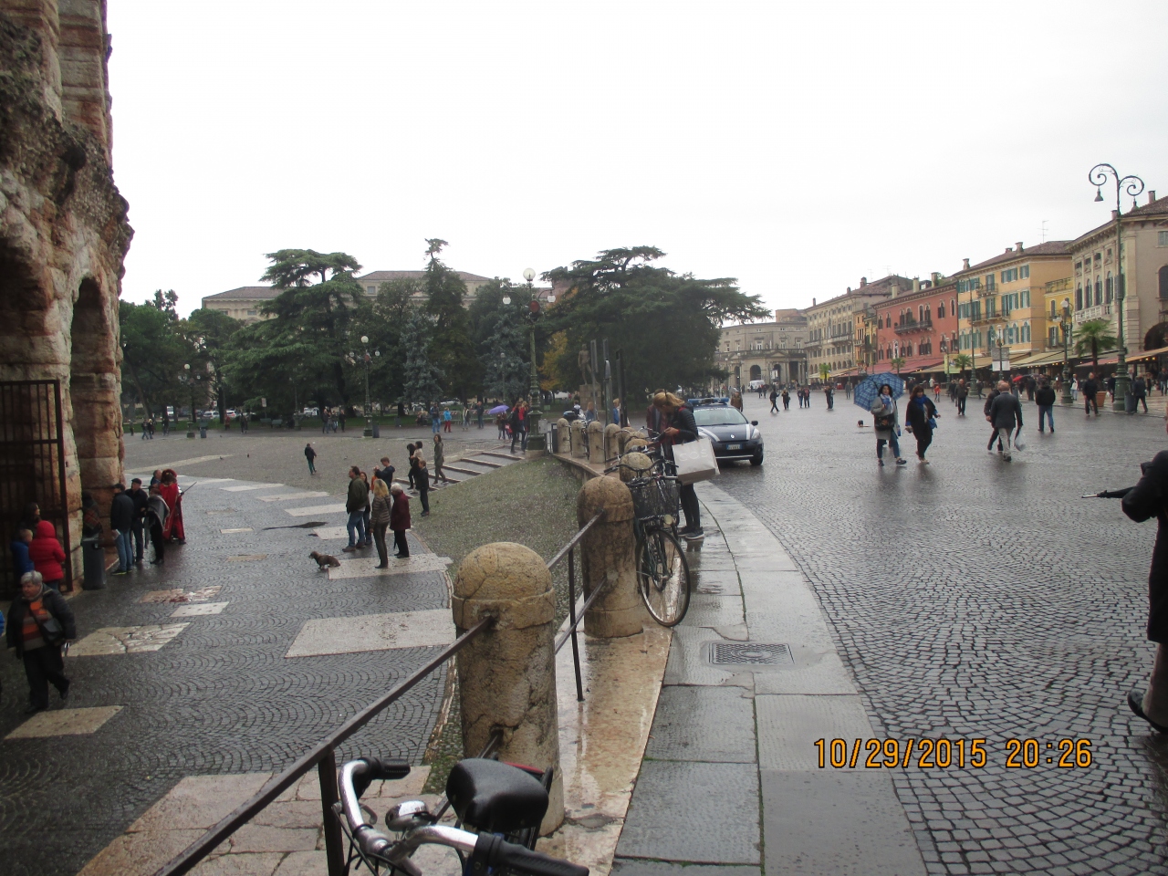 北側にはアレーナに向かってレストランや土産物屋が並んでいます。レストランの前にはオープンカフェがテントを張って並んでいましたが、さすがにこの季節、雨模様の天気でもありお客はまばらでした。季節がよければ、天気が良ければ気持ちの良いところになるのでしょうに。