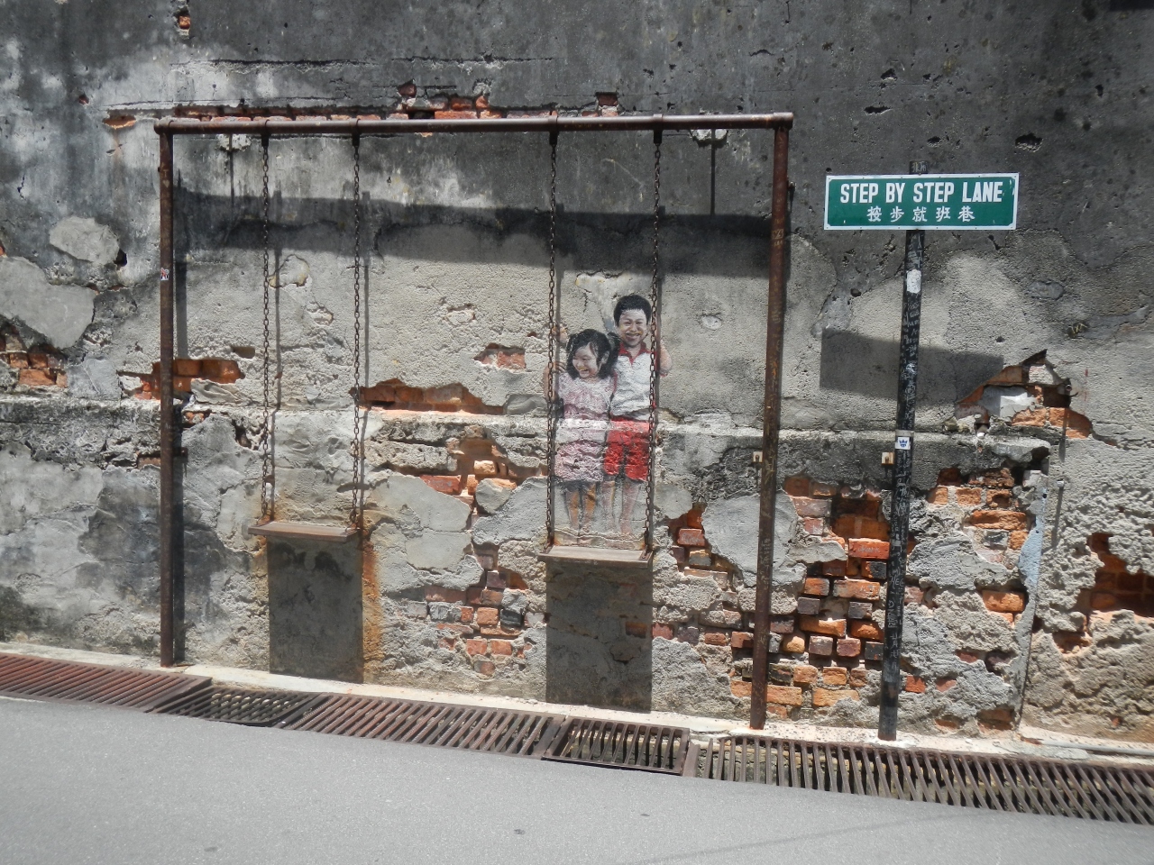 観光案内所でストリートアートが記入された日本語の地図をもらったので、ストリートアートを探して街を歩いた。「ブランコの兄妹」「自転車に乗る子ども」「イスの上の少年」「バスケットボールで遊ぶ子ども」などが人気があり、その前で記念写真を撮る観光客が途切れることがなかった。