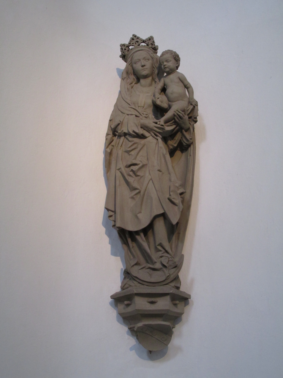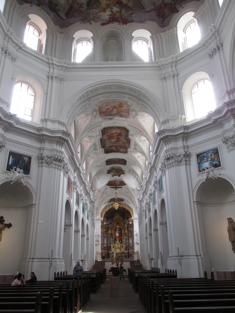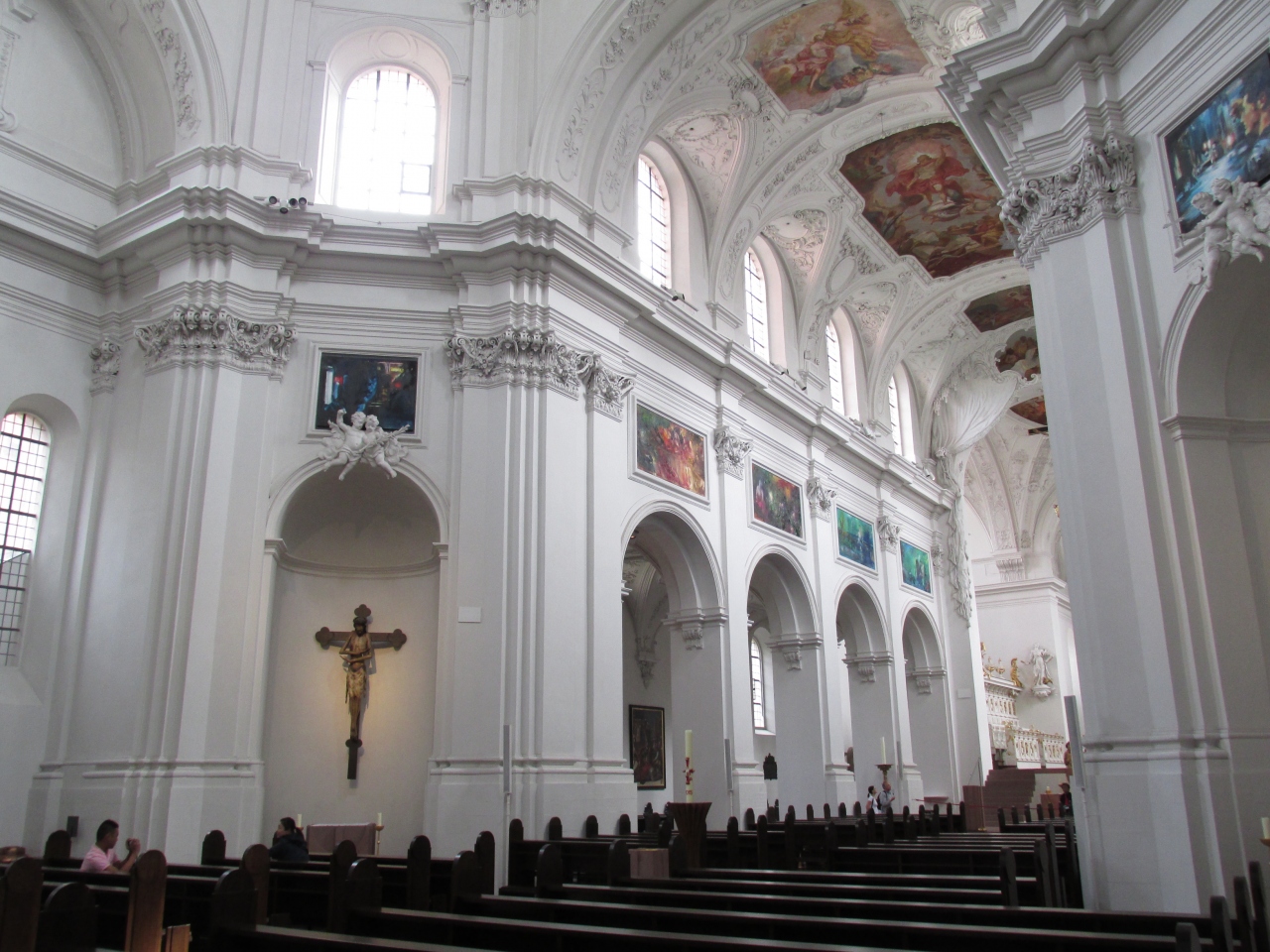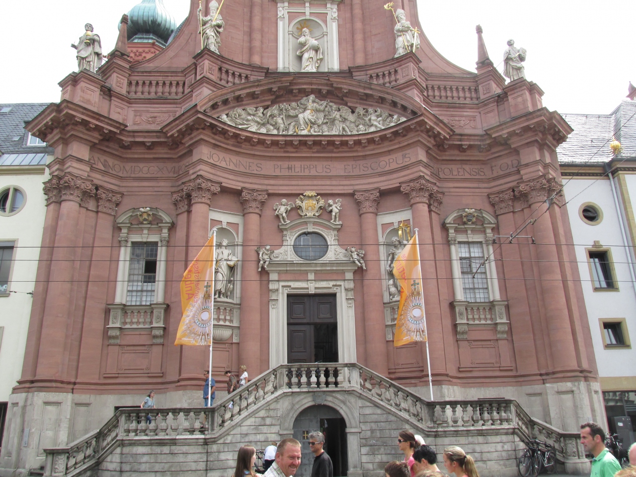 赤い教会の中は白い壁の内部で、金色の祭壇が輝いていてとても綺麗でした。ヴィース教会の作者と同じだそうです。リーメンシュナイダーの作品像もあります。地下の墓地には聖キリアンの墓があるそうです。マルクト広場にあります。