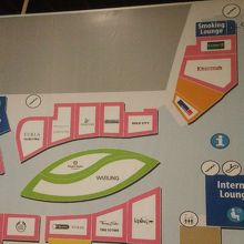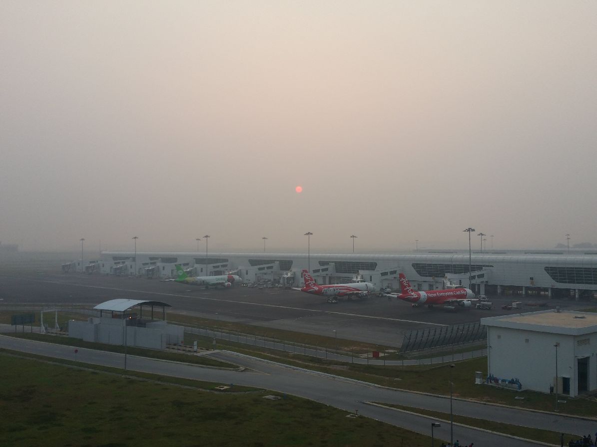 インドネシアの火山噴火の影響なのか、カスミがかかった景色です。空港の離発着には問題はないのかな?ここで制限区域内で唯一タバコが吸える場所はこのマップ記載の所です。新しくなった空港は過ごしやすく雰囲気も良いですね。