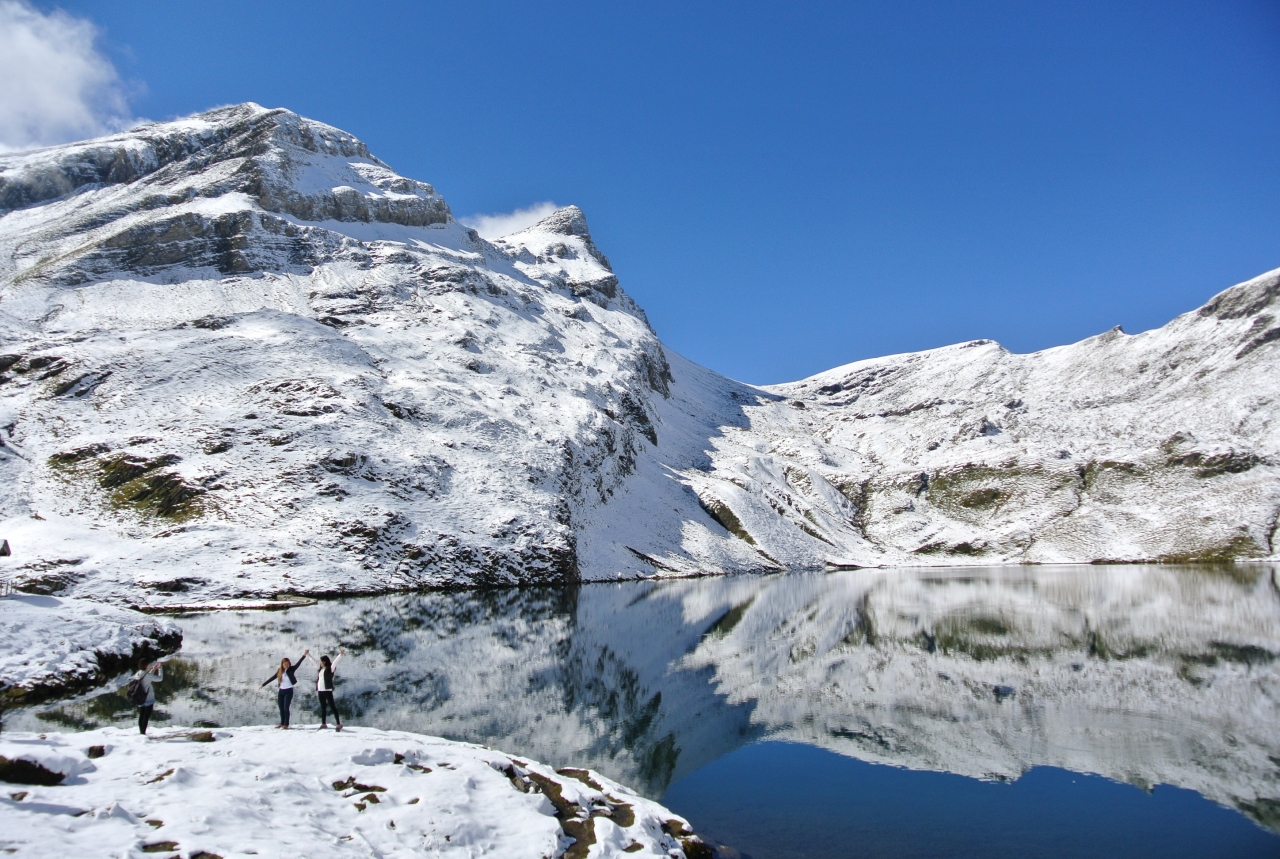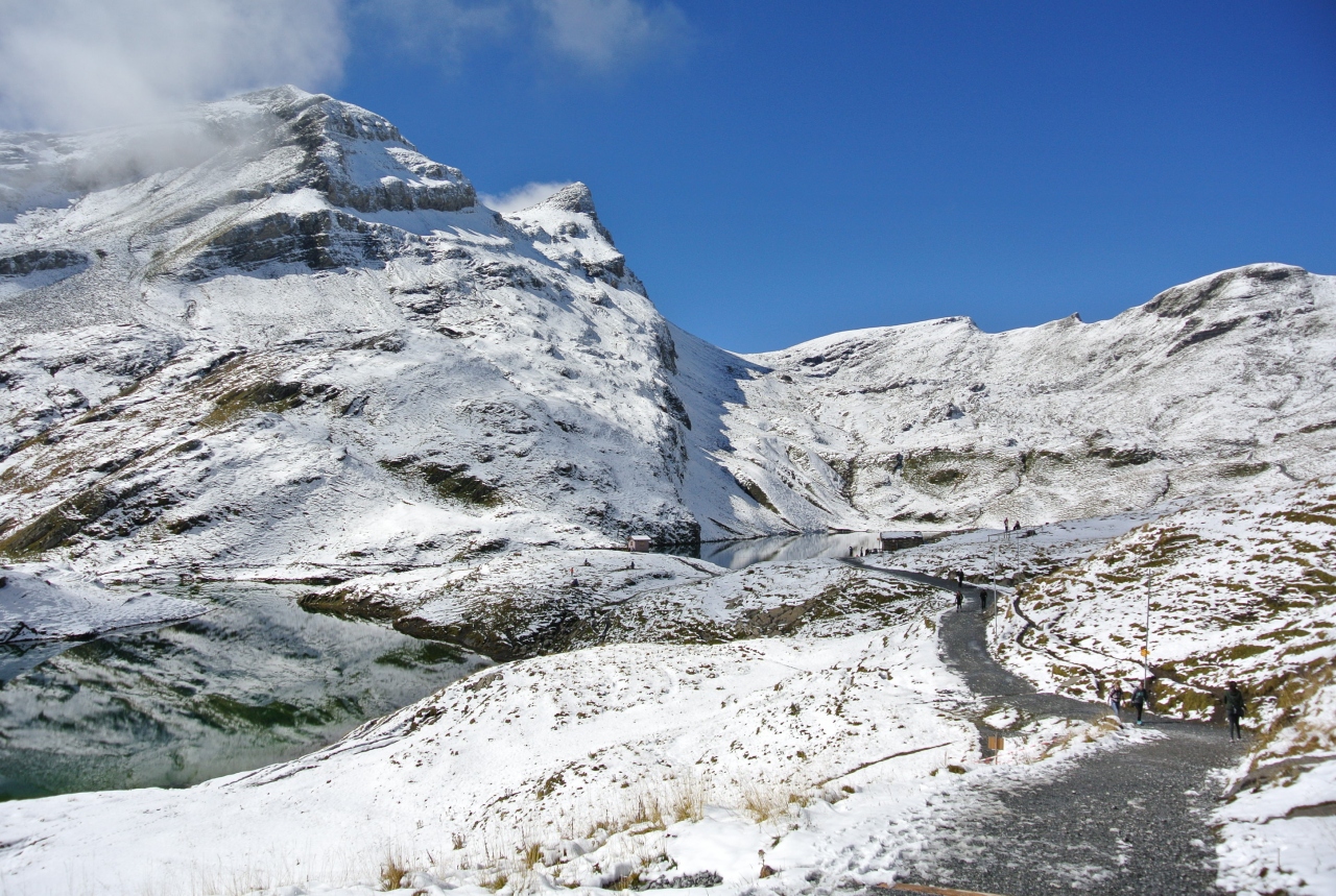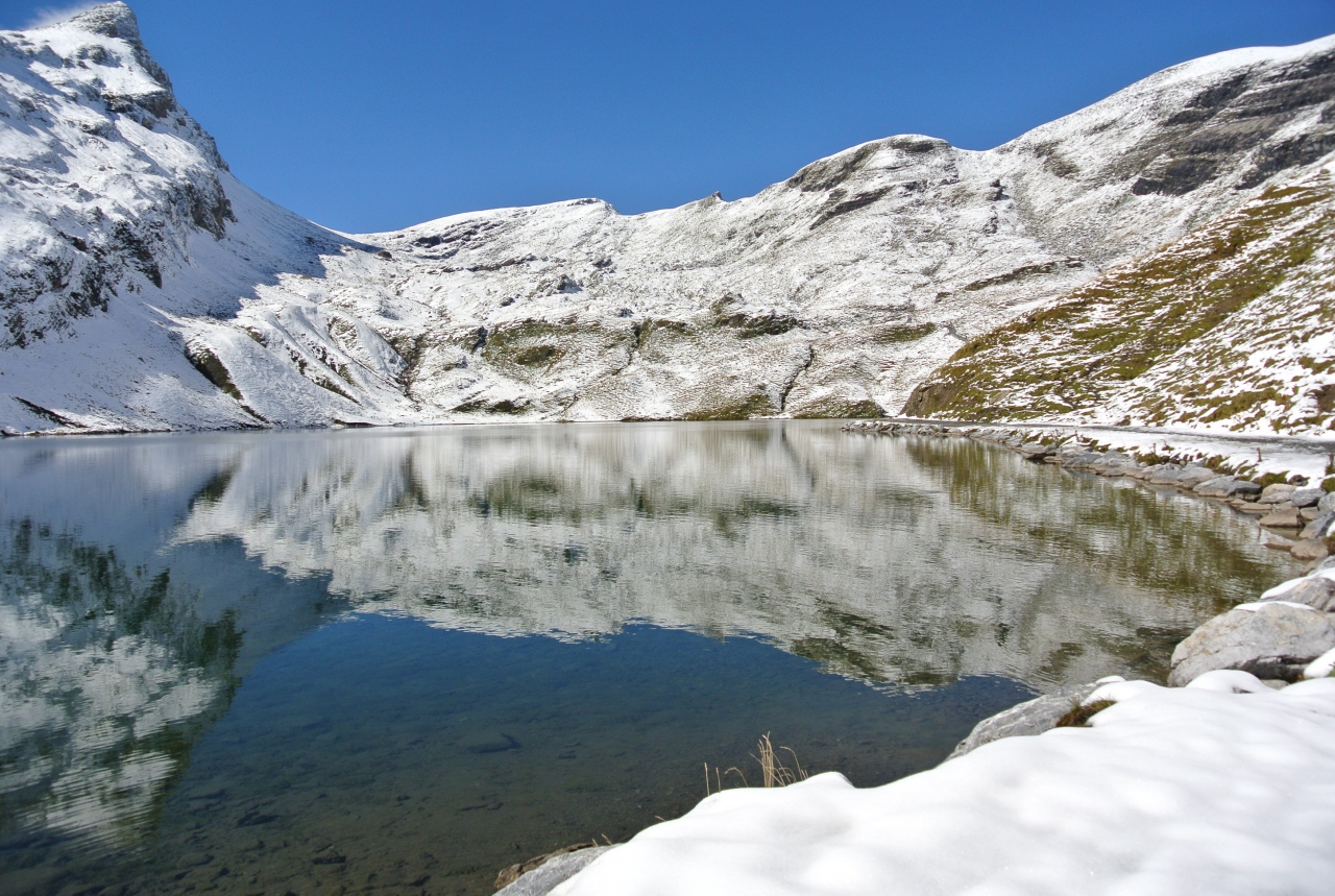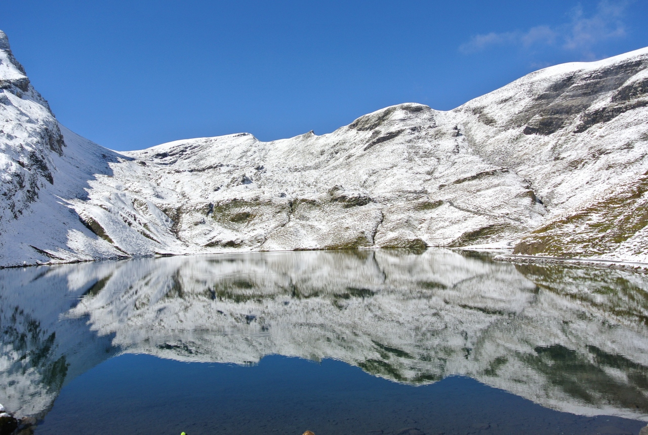 バッハアルプゼーに行くためには、フィルスト駅から片道60分歩かなければなりませんが、このアクセスの悪さゆえ、訪れる人は少なく、絶景を独り占めできます。穴場です。私が行ったときは、バッハアルプゼーに向かう道中にガスが発生し、時間に余裕がなかったこともあり、途中で何度も引き返そうと思いましたが、何とか思いとどまって湖までたどり着きました。湖に着くとガスが晴れ、湖面が鏡のように正面の山を逆さに映し出し、素晴らしい風景を望むことができました!