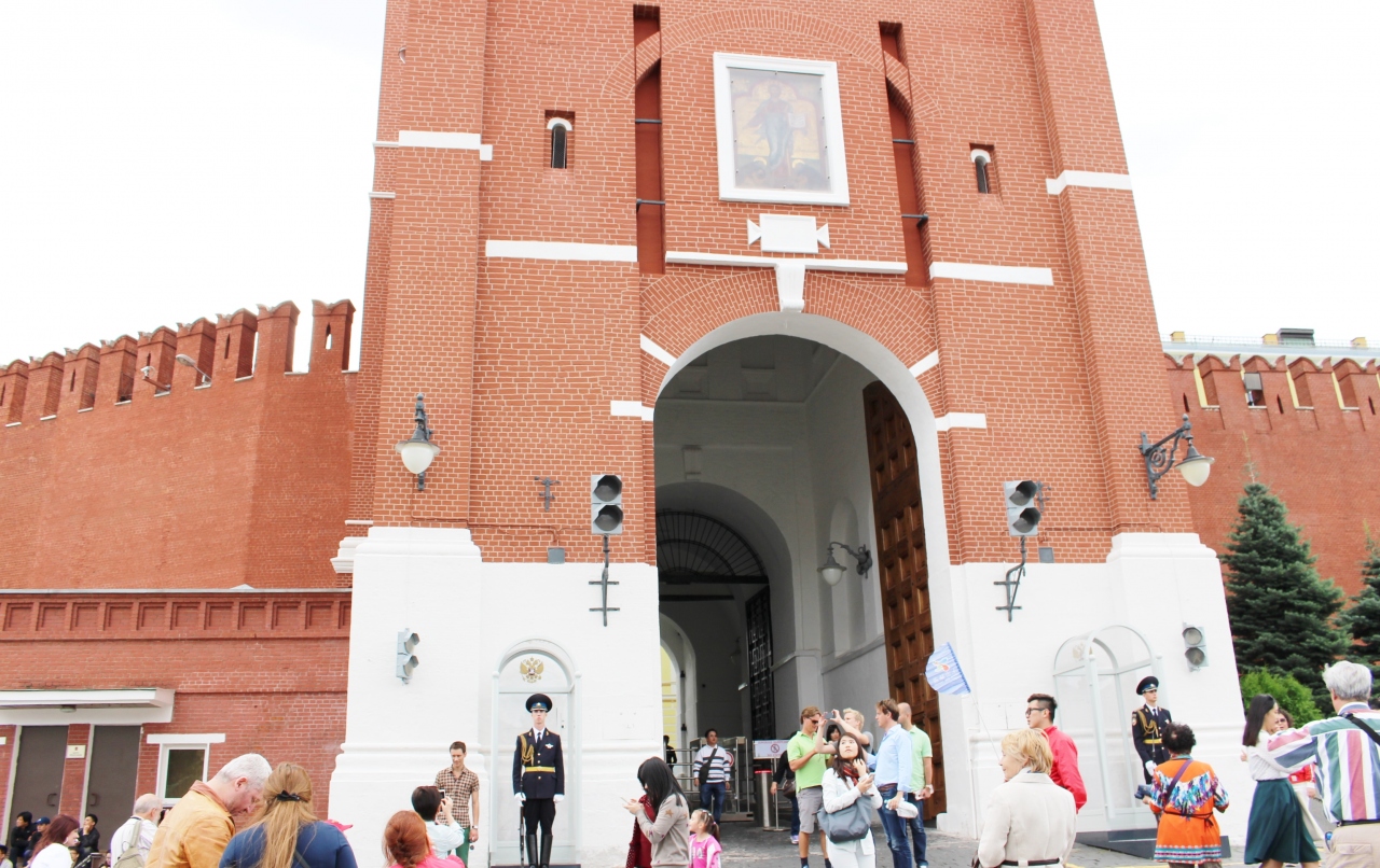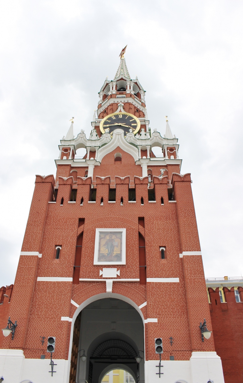 赤の広場に面するクレムリンの塔の1つで、塔の上に赤い星が輝いています。時計があるので他の塔とはすぐ区別できます。クレムリンの公用門で、大統領もこの塔の下の門を使用するようです。そのため警備も厳重でした。
