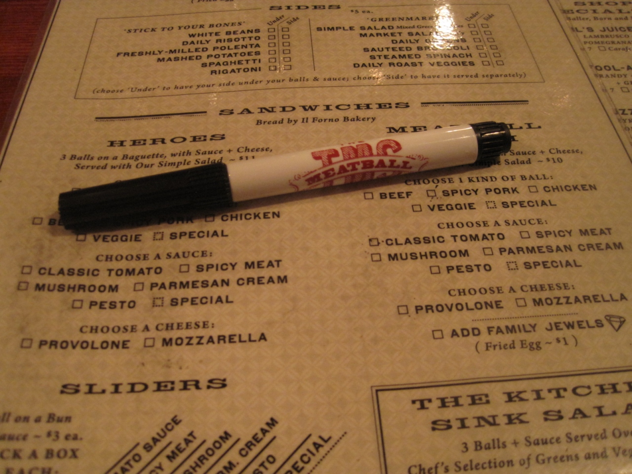 んでミートボール、注文はパウチされたメニューにマジックでチェックを入れて行います。