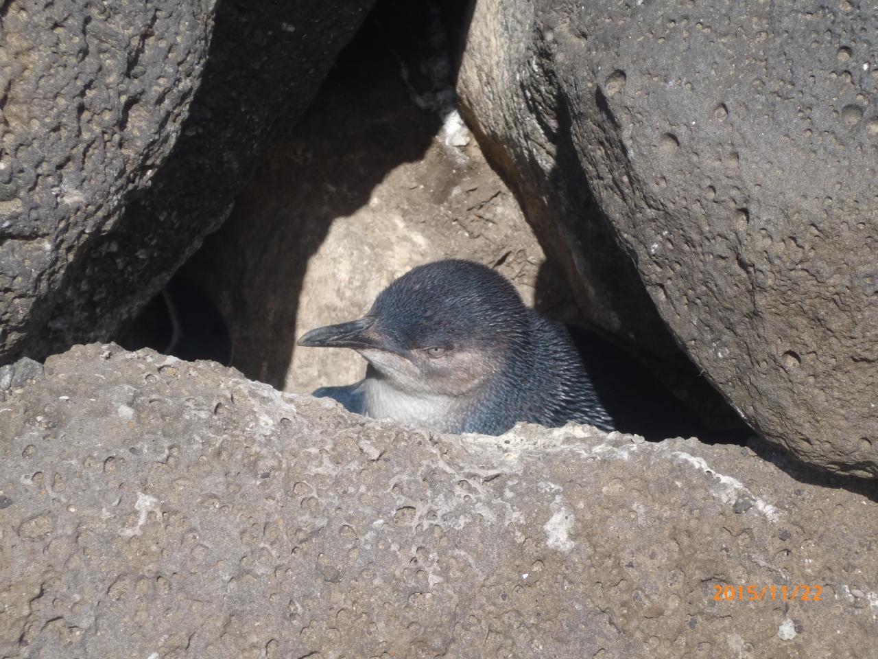 セントキルダビーチ駅(ルナパーク遊園地)からビーチへ出て、そこから沖にある堤防まで10分少々歩きます。ヨットハーバーもあるのですぐわかります。奥にあるレストランの裏手に「ペンギンの写真の入った看板」が・・・・。ハーバーのウッドデッキ・階段を降りると、観光客がカメラをパシャパシャと。堤防裏の岩の中に、マジに野生のペンギンいました。ツアーで遠くまで行かなくてもいいかもです。