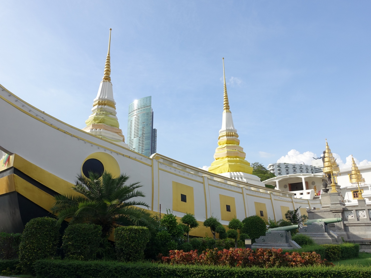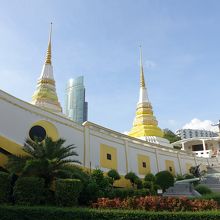 チャオプラヤ川を航行する船の拠点となる駅、サートーン桟橋の近くにあるお寺です。ここの波止場を利用する観光客は大変多いですが、このお寺まで足を延ばす人は、少ないようです。境内はパーキングにもなっていて、その向こう側に、この大きな船が見えます。