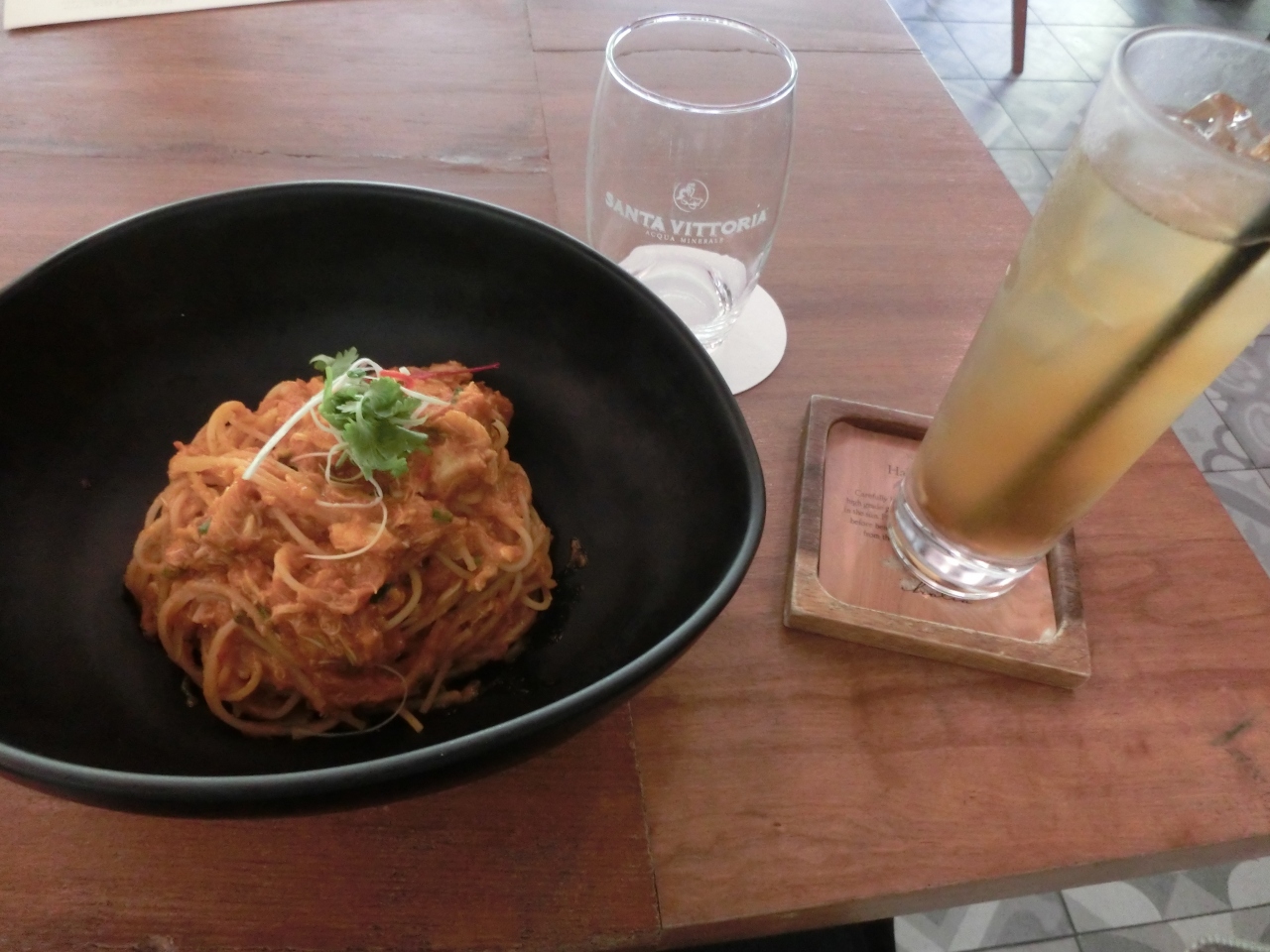 シンガポールの名物料理「チリクラブ」、食べてはみたいものの1人では量が多すぎるらしいということで断念していましたが、この店ではチリクラブをソースにしたパスタがあると知り、ちょうどボタニックガーデンにも行ってみたかったので、この店で昼食をとる旅行スケジュールにしてみました。店はジンジャーガーデンの近くにあり、各メニューにショウガを活用しているのが特徴です。ショウガを使った飲物も、アルコール、ノンアルコールとも揃っています。目当てのチリクラブパスタにもショウガが使われていて、チリソースの濃厚な味に爽やかさが加わって、飽きの来ない味になっていました。蟹肉はふんだんに使われていて、蟹を食べているということが充分に実感できました。本物のチリクラブは食べていないので、比較をすることはできませんが、少なくとも私がシンガポールで食べた料理の中では最も満足できる一品でした。