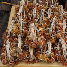 このお寺の裏手に回ってちょっといったところで朝市やってました。さすがラオス!さすがメコン河!と勝手に感動してしまうような売り物が多いです。徳積むための小鳥セットはもちろん沢蟹を上手にしばったものからよくわからない魚までみていて飽きません。