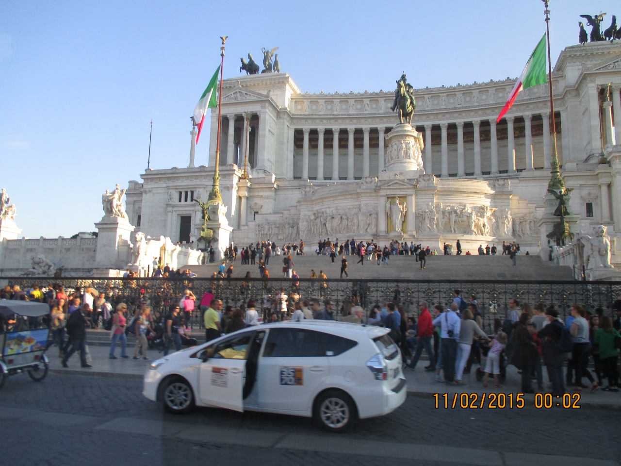 正面の騎馬像がその国王ヴィットーリオ・エマヌエーレ2世だそうです。後ろはカピトリーノの丘で小高いところに建っており、この建物にはエレベーターが設置されているので、屋上まで上ると、360度のパノラマでローマ市街が見えるそうです。