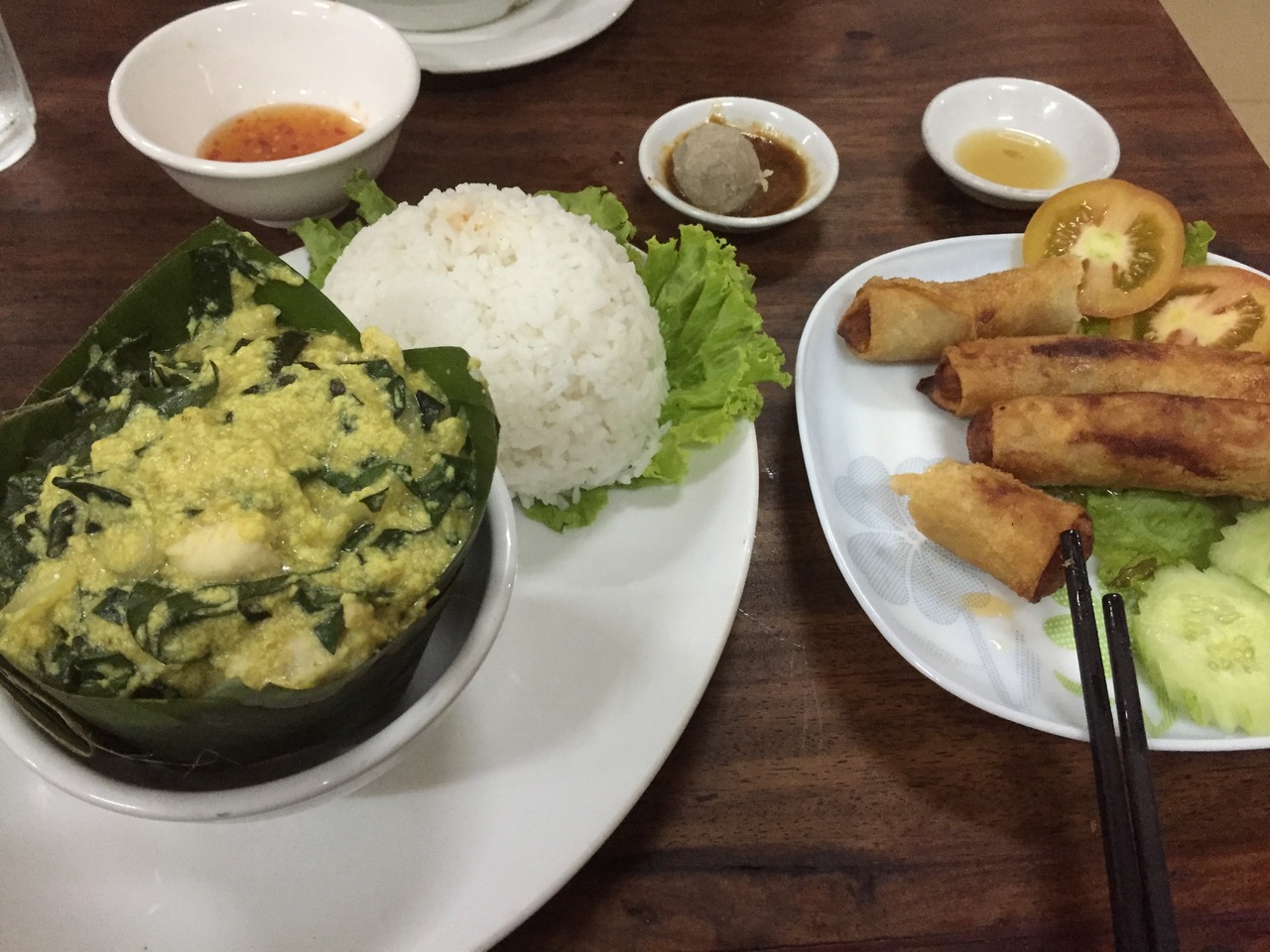 牛肉ボール入りヌードルスープ。揚げ春巻き、アモック。アモックが美味。