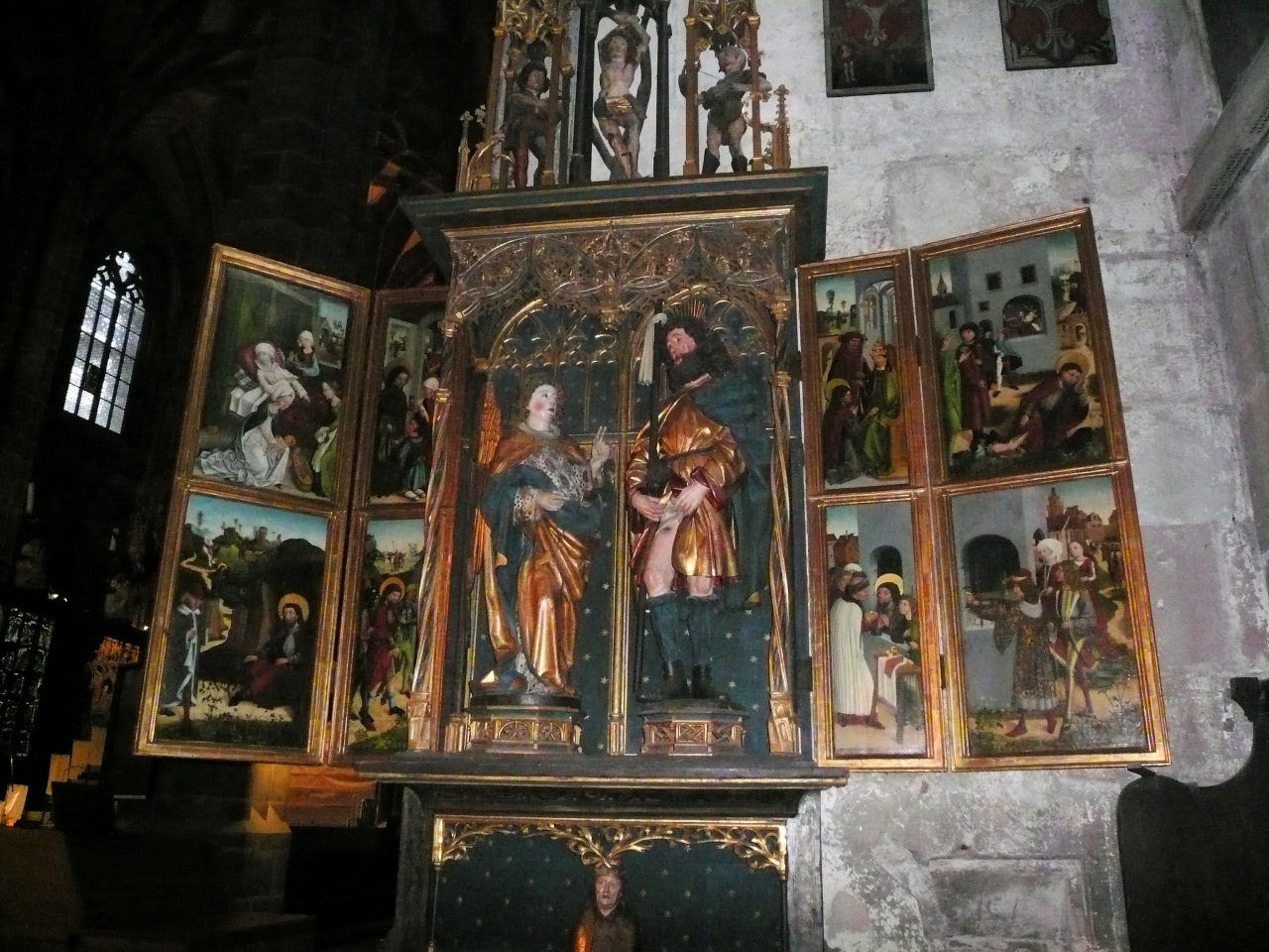 デューラーの師や弟子などが手掛けたカタリーナ祭壇も見事に彩色されたものだが、同時代のリーメンシュナイダー作品とは大きな違いがある。