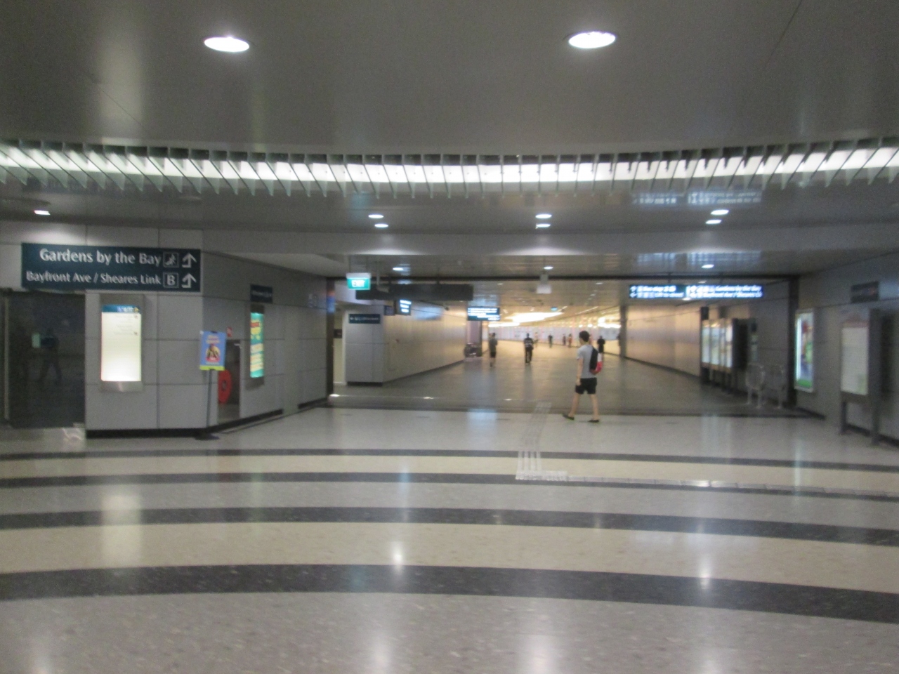 ベイフロント駅の改札口からエアコンの効いている地下道を歩くとガーデンズ バイ ザ ベイまでアクセスできます。暑い日や雨の降っている日はこの地下道を有効に利用することができます。出口では地上へのエスカレーターはなく階段のみで、エレベーターがありました。