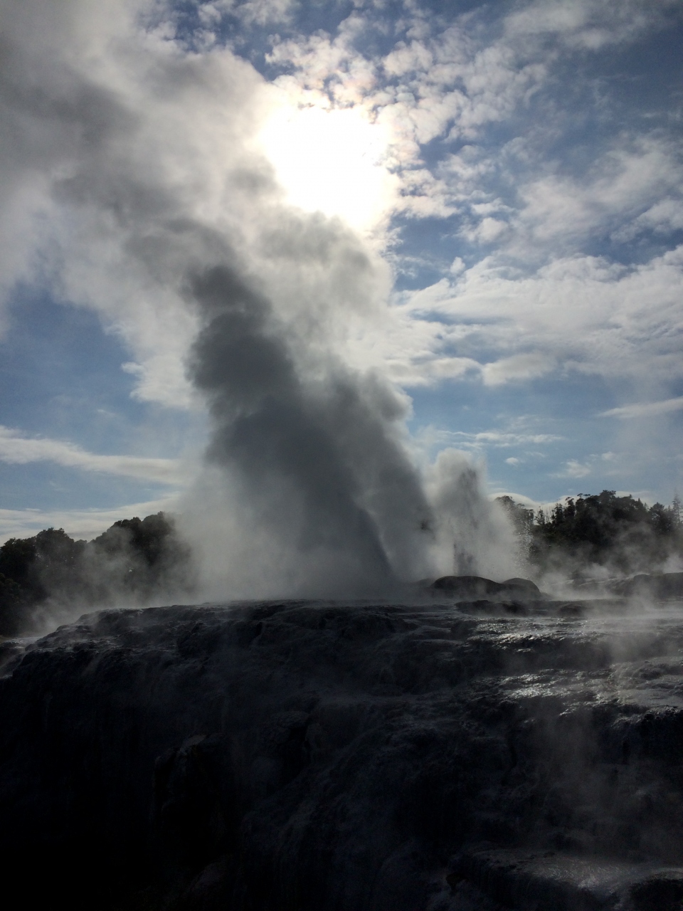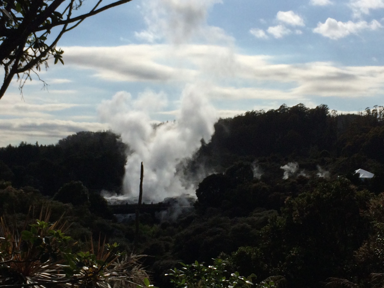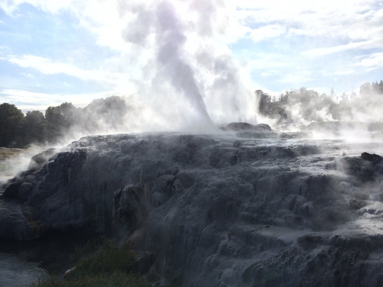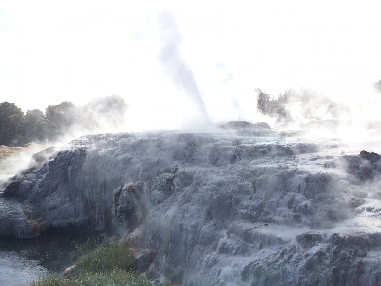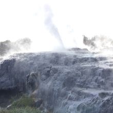世界的に有名な間欠泉や暑い泥が湧き出す泥泉、調理泉、キウイハウス、マオリ村、伝統工芸の工房などが敷地内に点在する地熱地帯をテーマにした総合観光施設です。ビジターセンターから、ぐるっと一回りすると1時間半程の観光ウオーキングになります。最大の見所はホフツ間欠泉です。日に20回、1回に15~20分ほど、30mの高さまで吹き出す間欠泉は圧巻です。