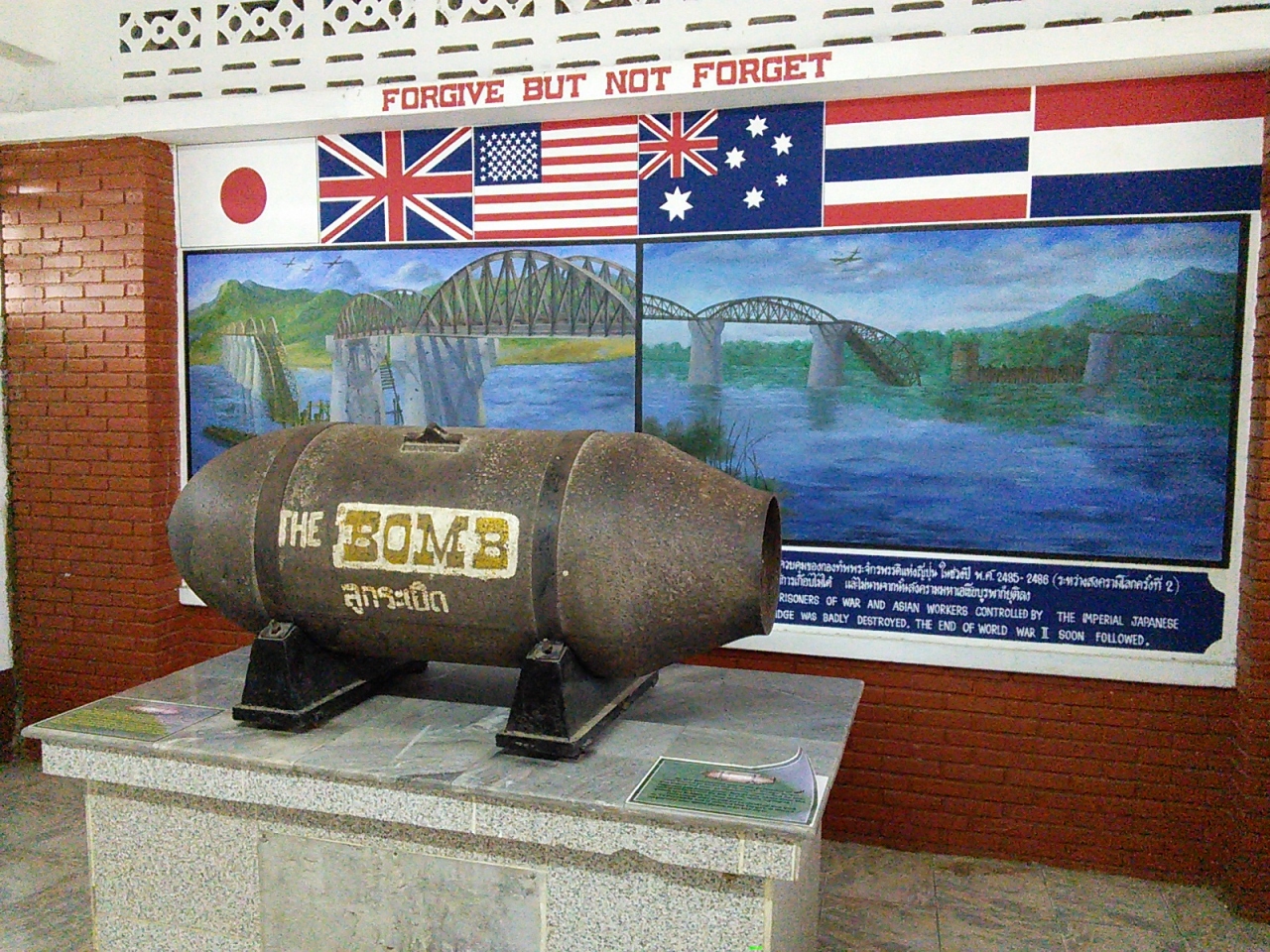 場所はクウェーヤイ川がクウェーノイ川とメークロン川とに分かれる分岐地点付近にあるワット・チャイチュムポンというお寺の横にあります。小さな博物館です。展示品はセクション1~3に分かれており1は捕虜収容所を模した竹で作られた建物で当時の写真や日本軍による捕虜への拷問を描いた絵など、2は銃や砲弾、軍刀などの武器や飯ごうなどの日用品、3は当時の新聞記事が展示されています。我々日本人にとっては重苦しいものも多いですが敷地内の奥にはメークロン川を眺められる遊歩道があるので川を眺めながら一息つくこともできます。