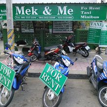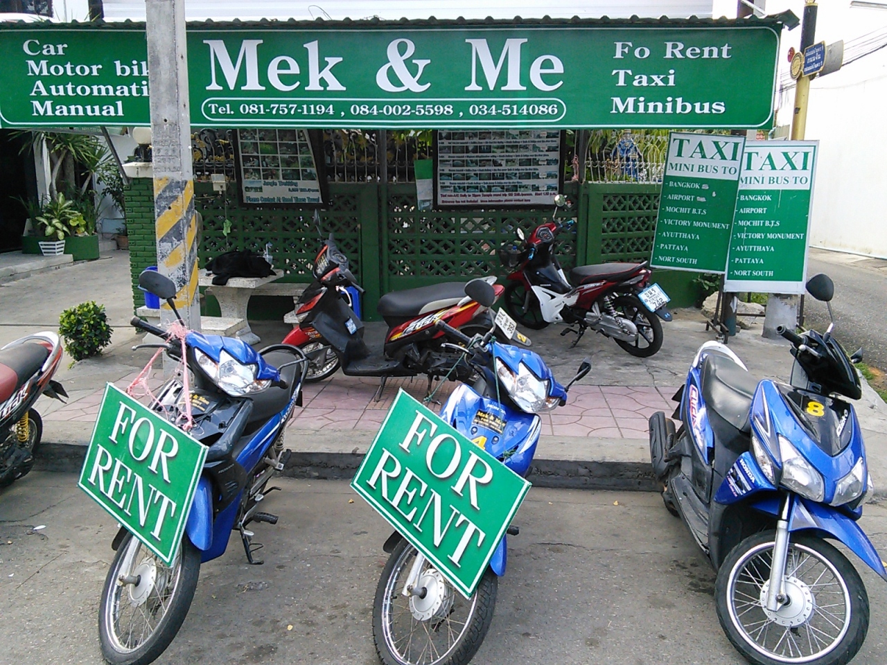 ゲストハウスが集まるメー・ナム・クワイ通り沿いにはレンタルバイク屋が多くあります。何軒かあたりましたが相場は24h200B。しかし安いところを発見。緑のに看板が目印の「Mek & Me」では150Bです。パスポートをデポジットとして預けるので念のためコピーを携帯した方がいいと思います。ヘルメットは貸してくれます。運転免許証はなくてもOK。店の人曰く、ヘルメットさえ被っていれば警察に停められもノープロブレムだそうです。