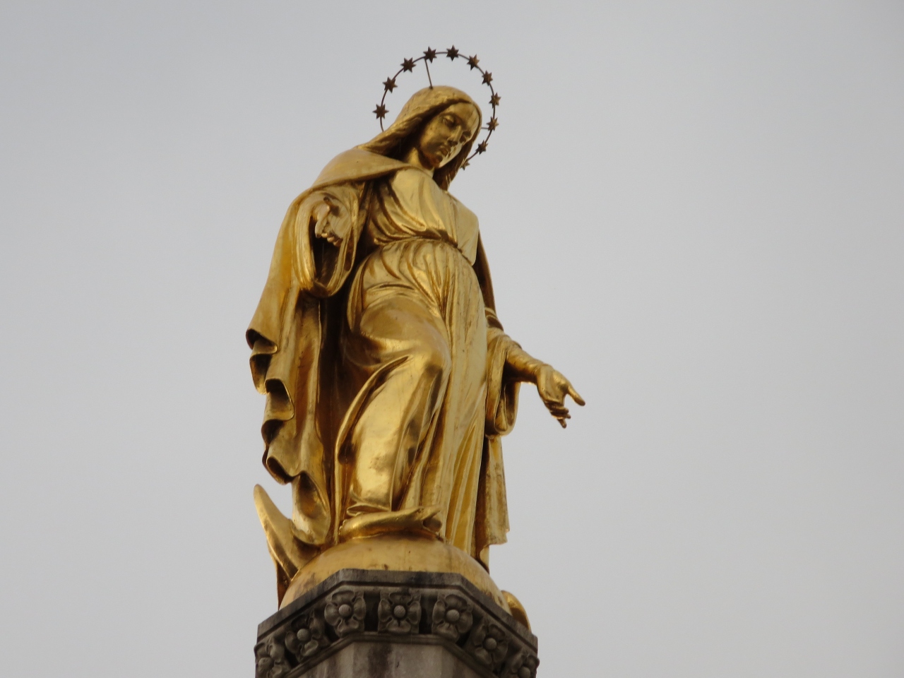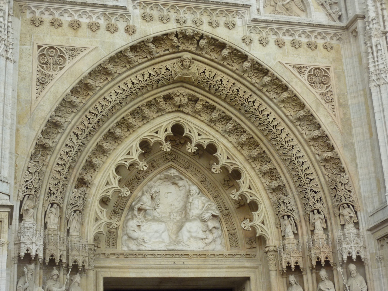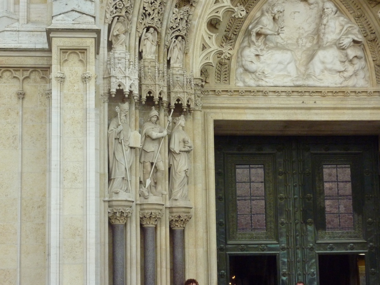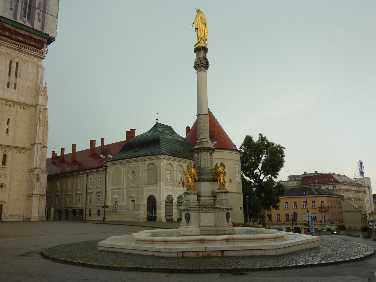 高さ100m以上もある二つの尖塔はザグレブの街の至る所から見えます。現在の外観は1880年の地震後に復旧されたもので、オスマントルコ軍から守るための白い城壁に囲まれています。ネオゴシック様式で再建されましたが、砂岩を用いて造られたため損傷し易く、現在補修工事が行われています。ファサードの彫刻は見ごたえがあります。大聖堂前の広場には金色の天使に囲まれた塔があり、その最上部には聖母マリアの像が金色に輝いています