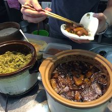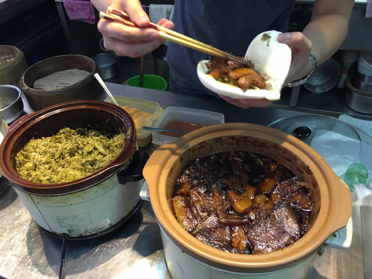 柔らかく煮込まれた豚バラに、高菜、ピーナッツの粉を、手際よく包子に挟んでいきます。 ふっかふかの包子で、思っていたより軽めかも。