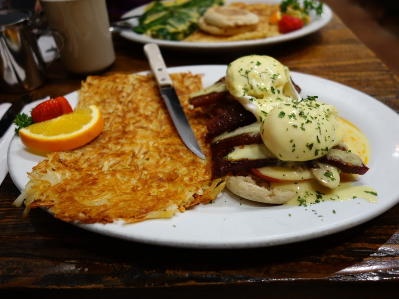 自分は分厚いベーコンが挟まったエッグベネディクトを食べましたがベーコンも美味いし卵にナイフを入れた瞬間に黄身が流れ出す感じも完璧!パーフェクトな熱の入り具合。アメリカンな朝食をお楽しみあれ。