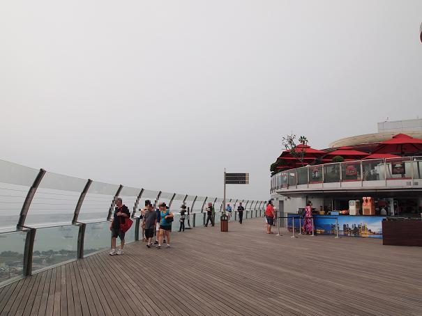 マリーナベイサンズの上にある展望台です。一般客はチケット代がかかりますが、ホテルの宿泊客はルームカードを見せると無料で入ることが出来ます。マリーナ湾周辺にそびえ立つビル群、シンガポールフライヤー、ガーデンズバイザベイなど、シンガポールの景色が一望できます。プールからとはまた違う角度の景色が楽しめるので、宿泊客でも行ってみると良いと思います。マリーナベイサンズのオリジナルグッズや、飲み物などが置いてある売店もありました。