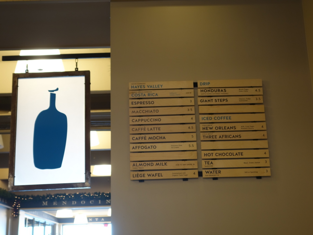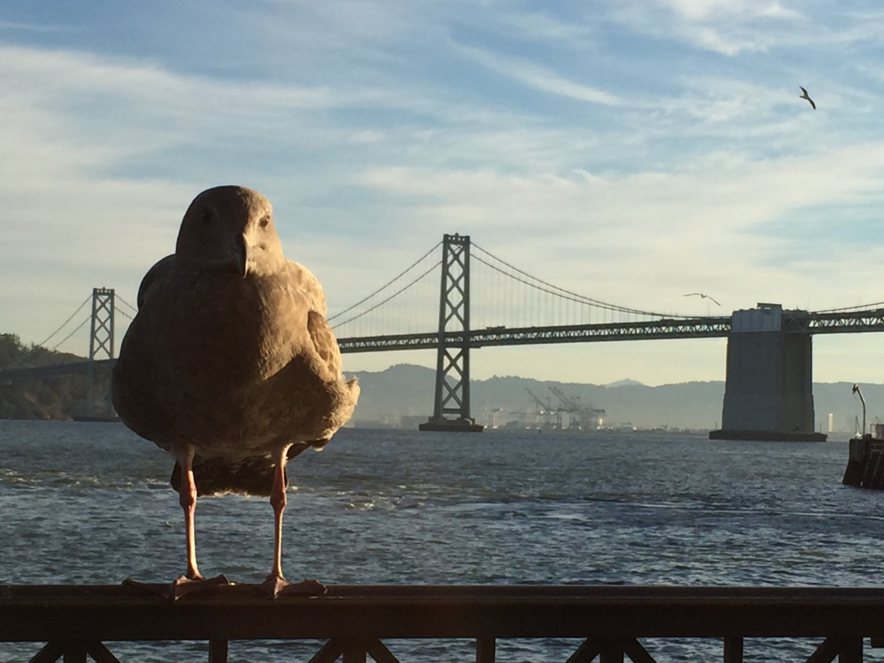 ココはスタンド形式で椅子もテーブルもありません、場所柄通勤客が出勤時にコーヒーを買っていく感じかなって思いますが、フェリービルディングの海側にはベンチが並んでいるのでベイブリッジを眺めながら外で飲むコーヒーも乙なものです。写真のように鳥ぎ近くに寄ってくる事も、すごく人に慣れてるのか静かにコーヒー飲んでたらいつまでも近くにいたりします。