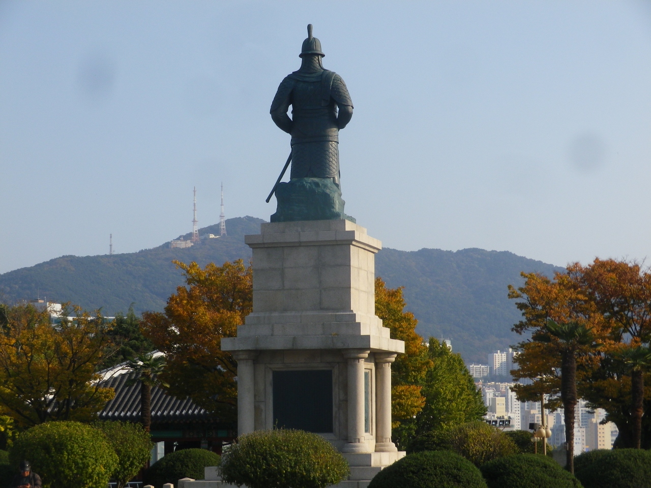 釜山市街の高台にある、釜山市民の憩いの場である龍頭山公園にある釜山タワーのそばにある銅像です、行った際ちょっとだけ見ました、日本軍と戦った韓国の英雄である李舜臣将軍の銅像で、韓国内には他の場所にも李舜臣将軍の銅像があります。