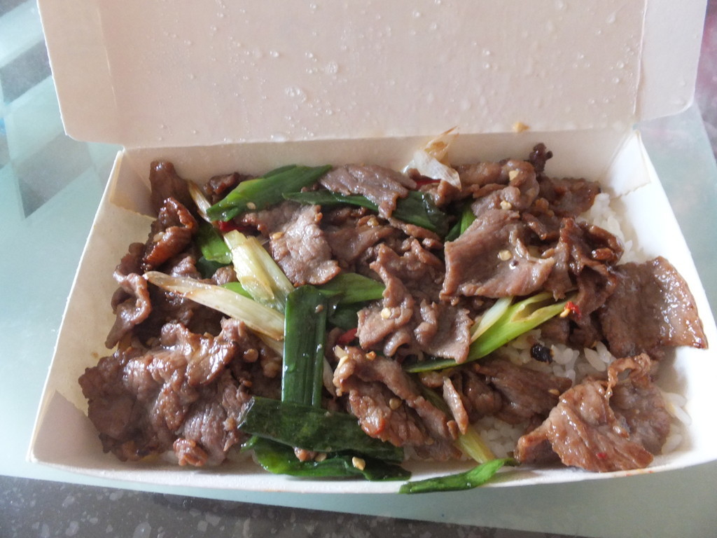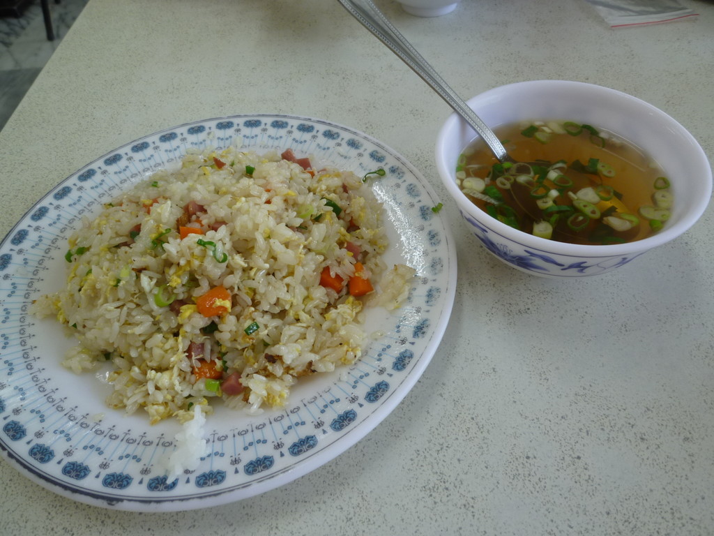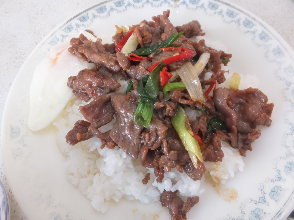 ここの葱爆牛肉は私にとって黄家牛肉麵の葱爆牛肉と双璧です。ちょっと食欲が落ちた時はこちら、ガッツリ食べたい時は「黄家牛肉麵の葱爆牛肉」です。ここの葱爆牛肉は全く脂っぽくなく、とても食べやすいです。葱と唐辛子で牛肉を薄味のタレで炒め、目玉焼きと一緒にご飯に盛られています。スープはフリーです。