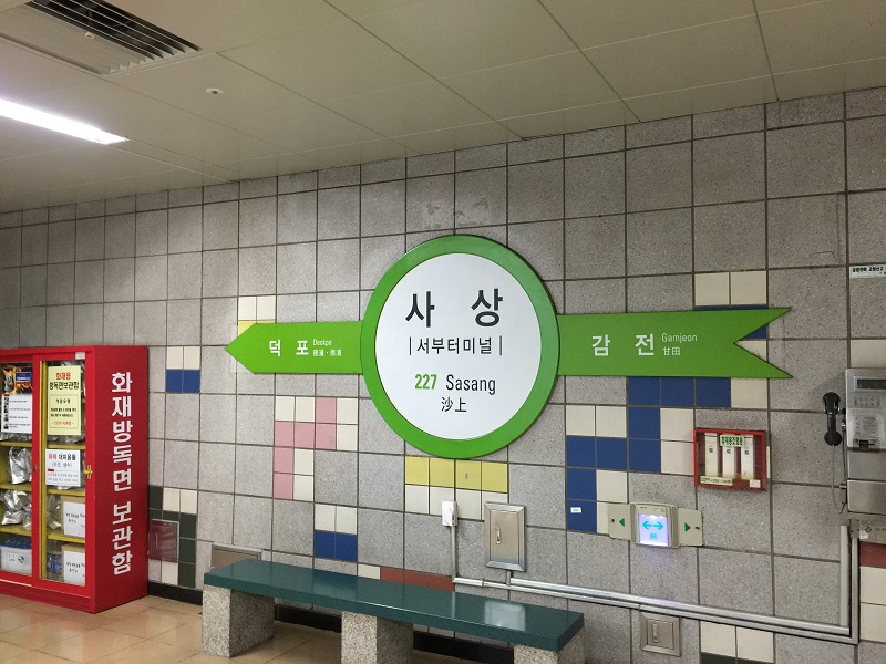 釜山の金海空港軽鉄道と地下鉄の乗り換え駅ですけども地上と地下で二つに完全に分かれていますね。乗り換えがちょっと歩くんで面倒ですけどもまあ許容範囲じゃないですかね。韓国語ではササンといいます。軽鉄道は終点ですし、地下鉄は乗換駅では日本語の放送があるので迷う心配はないんじゃないでしょうかね。