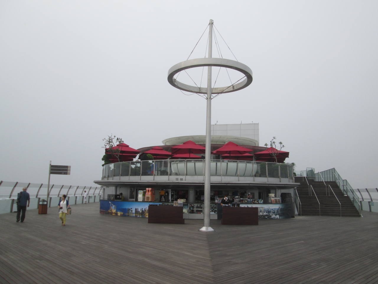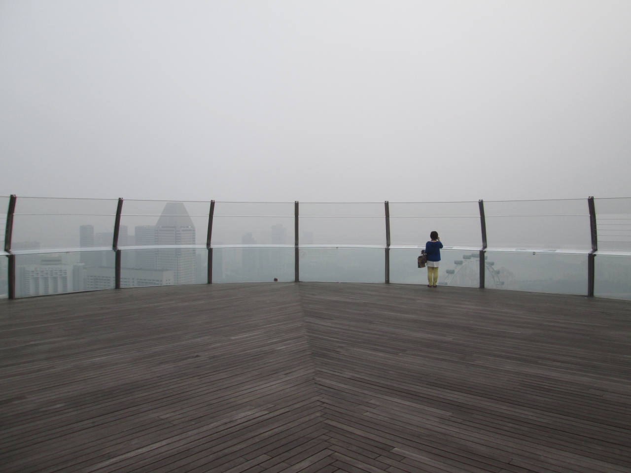 9月のシンガポールはインドネシアからのヘイズ(煙害)で視界が悪い日がありました。写真では視界不良のように見えますが、サンズ スカイパークは高いところに位置しているので、マリーナベイエリアの景色が一望できました。