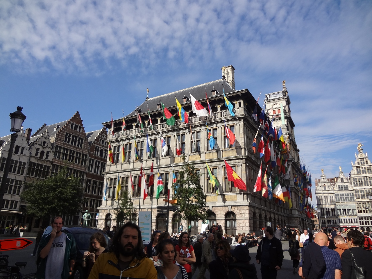 ノートルダム大聖堂から小道を抜けて、マルクト広場につきました。旗に飾られた市庁舎がきれいでした。鐘楼部分は、「フランドル地方とワロン地方の鐘楼群」の一つとして、ユネスコ世界遺産に登録されています。彫刻が素敵です。