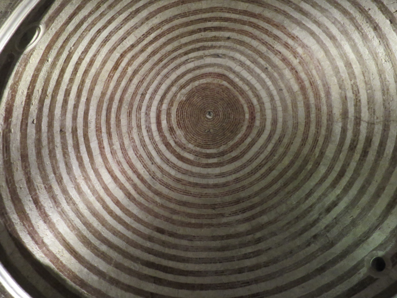 天井クーポラに数多くの円が上へ向かっていく渦巻の螺旋形で、ずっと見つめていると目が回りそうです。