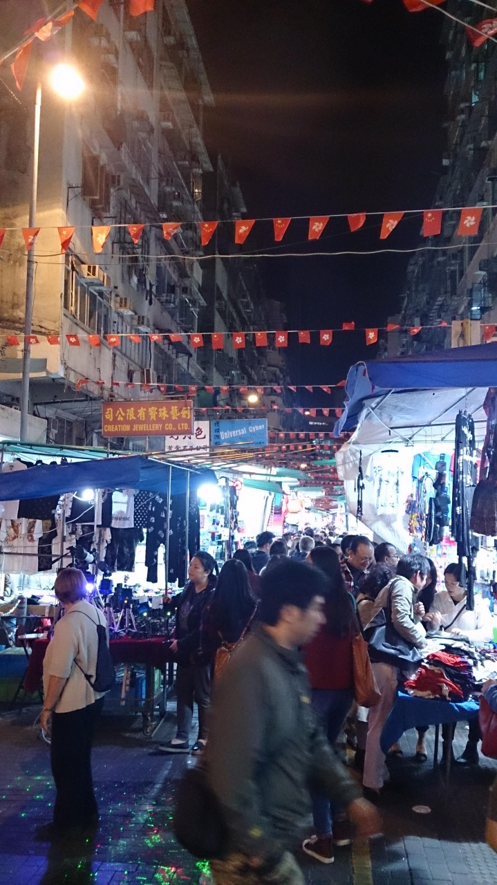 男人街というだけあって、その売られているものも洋服、雑貨などの物販、さらには飲食の屋台などはもちろん、ありとあらゆる物が売られていてとにかく楽しい街です。おもちゃなどもB級品がたくさんあって、いつまで壊れずに使えるのかなという感じの物もたくさんあります。特に男人街だけあって、思わず笑っちゃう物が売られていたりと何でもありの街という感じです。露店だけでなく、通り沿いのお店も店頭に商品やテーブルを出しており、ぎゅぎゅう状態のストリートになっています。訪問したのが金曜日の20時ごろでしたが、かなりの人出でした。ブランドショッピングとは正反対の全く違う香港らしい風景が楽しめる場所だと思います。