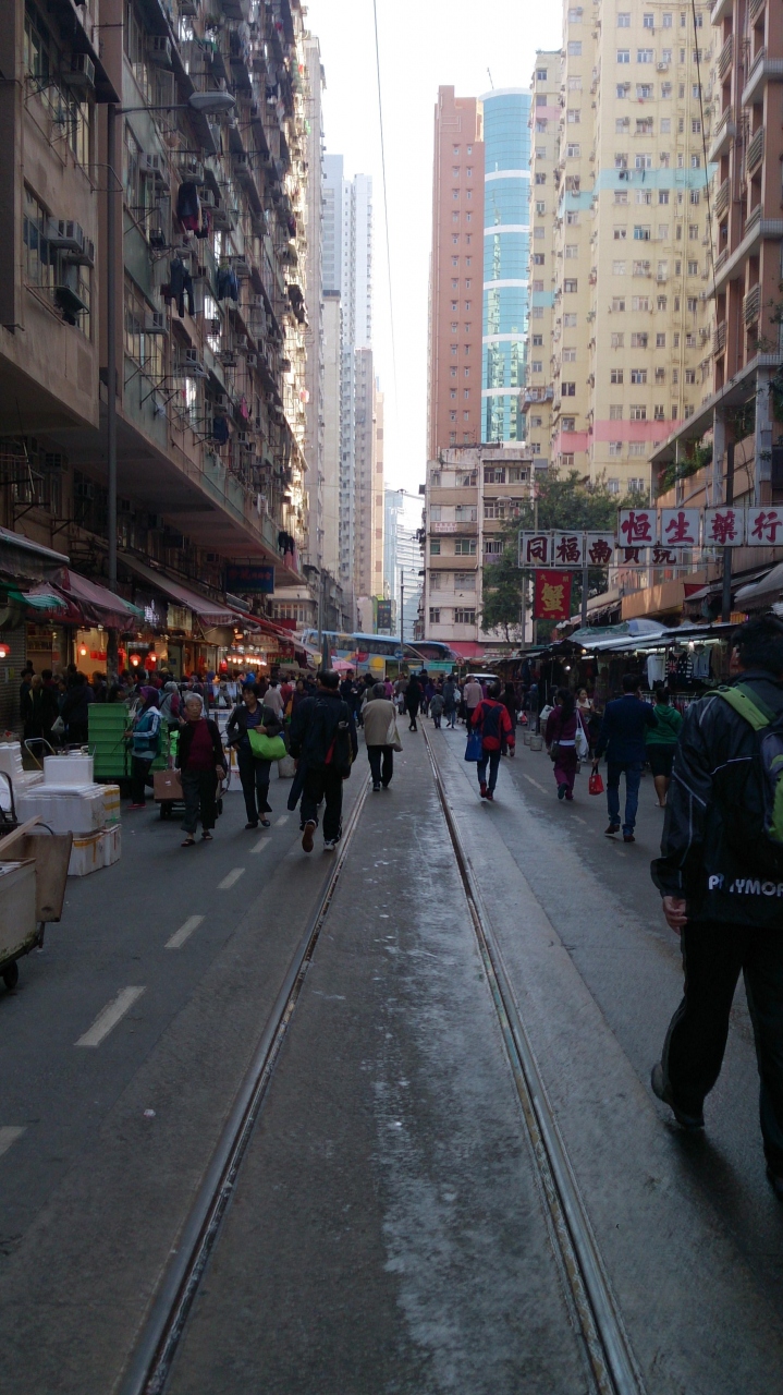 香港島でも庶民派の街と言われている北角で、その街の中でも一番庶民的とのこともあり、行ってみました。中央にトラムが通るためレールが敷かれ、その両サイドは中高層のアパートが連なっており、その1階部分が店舗になっています。色々なお店があって香港ローカルの方々の普段の生活が見ることが出来ます。地元ローカルの商店街という雰囲気です。生鮮食品のお店は店舗前が水浸しなので歩くときに注意しないと足が濡れます。香港の庶民生活を垣間見るのには楽しい場所だと思います。