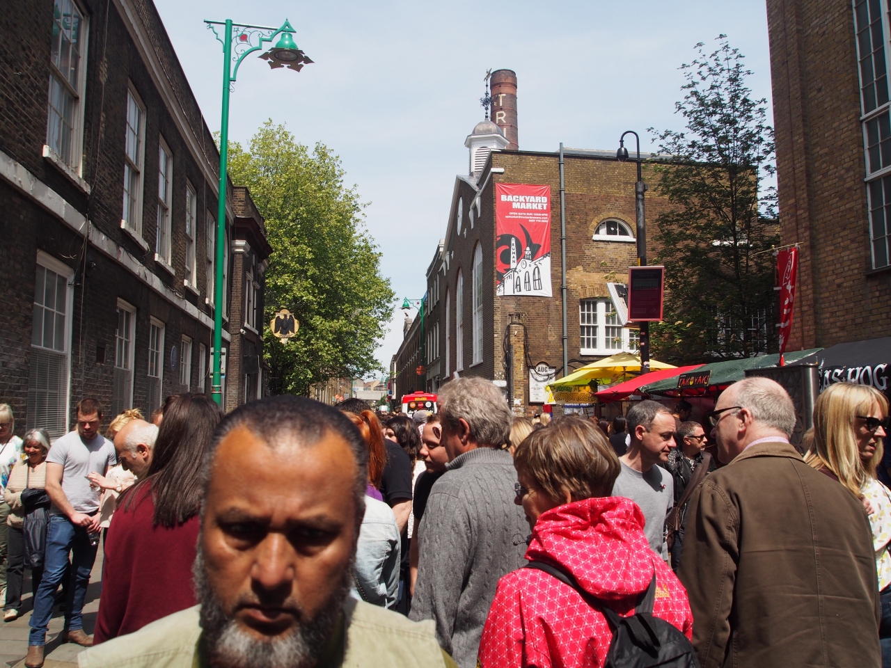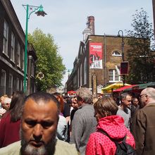 リヴァプールストリート駅から約10分ほど歩き、スピタルフィールズ・マーケットによった後、ブリックレーンに立ち寄りました。道の両側や室内にもたくさんの飲食の屋台が出ていて、人で混雑してました。日本食の屋台もいくつかあり、焼き鳥を食べました。