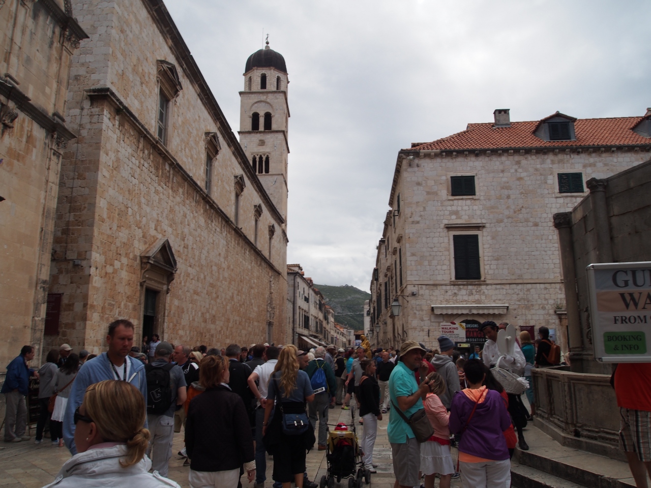 ピレ門から旧市街に入ると、目の前から港のほうにまっすぐのびる大通りで、いつも混雑しています。道の両脇にはカフェ、レストランやお土産物屋さんがあり、この通りから左右に細い通りがたくさんあります。石畳がぴかぴかしていて、特に夜は綺麗です。