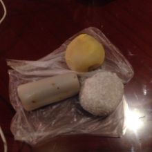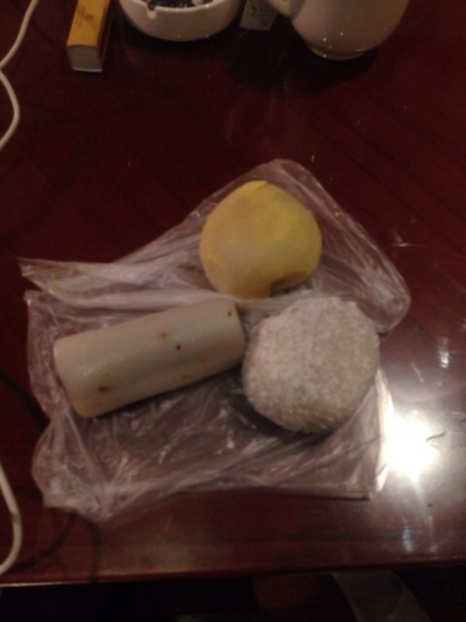 テイクアウトの窓口は2つ。窓越しにズラッと並んだお餅を見てオーダー。名前がわからなくても指差しで大丈夫、ビニール袋に入れてそのまま渡されます。色々な種類がパックになった物もありましたが、バラで3個購入。結構ずっしりお腹一杯になりました。