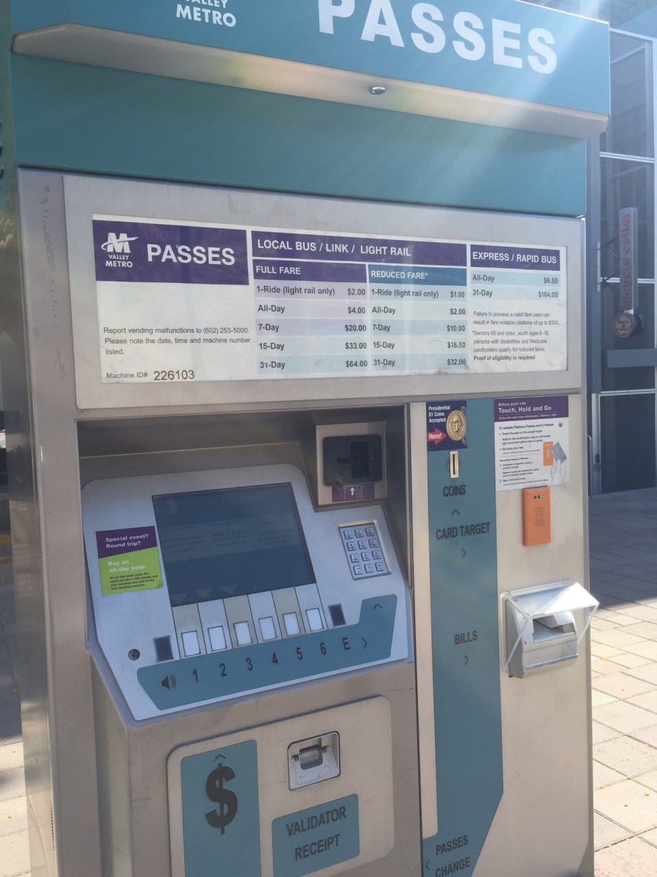 フェニックスで唯一走っている電車がこのライトレール。ダウンタウンから空港近くをとおり、メサのMain Stまで繋がっています。乗車券は1dayパスがオススメです。往復に加えてもう片道もしくはバスを利用すれば、すぐにもとがとれます。