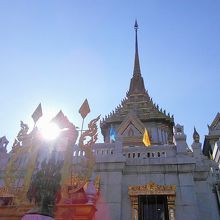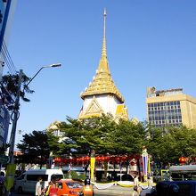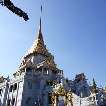 大理石の白い壁に黄金の鋭角的な屋根。いわゆる一般的な“和み系”のタイ寺院に比べるとずいぶんと“カッコいい”寺です。とても現代的なデザインですがとくに決まりはないのでしょうか?真下から眺めると分かりにくいですが外に出て通りから眺めるとその巨大さがよくわかります。
