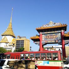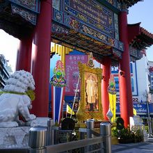 チャイナタウンの東端、ヤワラート通りの入口付近にあります。プミポン国王の72歳の誕生日を記念して中国系の住民により1999年に建てられたもの。表側にはタイ語で裏側には中国語で文字が書かれています。門の下には国王の肖像画が飾られていましたが見慣れないためか少し違和感を感じました。