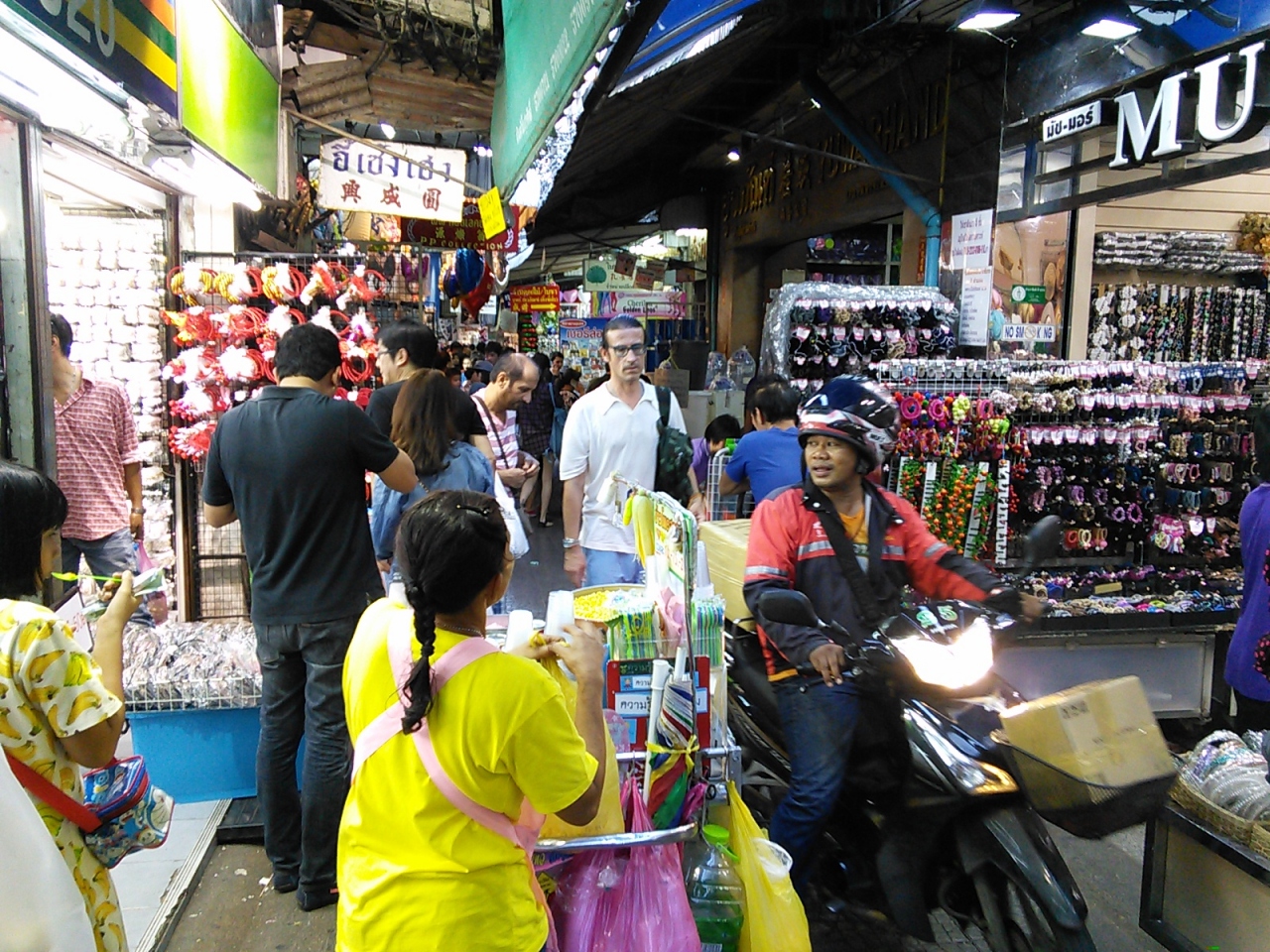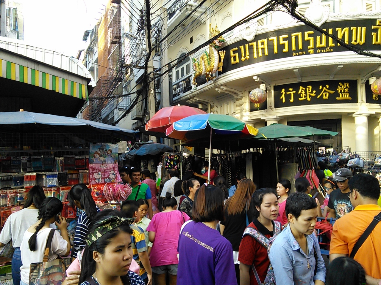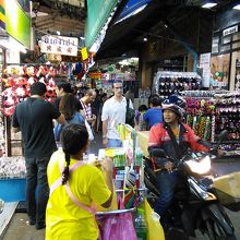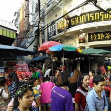 チャイナタウン、ヤワラート大通りの1本南側の路地。路地の両側には500mほどにわたってびっしりと店が並んでいます。布地、洋服、アクセサリー、おもちゃ、くつ、かばん屋など。卸しの店も多いです。土日はものすごい人出ですが平日でもかなり賑わっています。ただでさえ道幅が狭いのに商品がはみ出していたり、手押しの食べ物屋台が通ったり、バイクまでも。大渋滞でまったく進まないこともしばしば。スリもいるようなので持ち物には十分気を付けましょう。