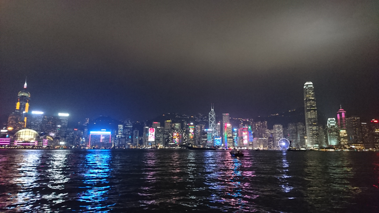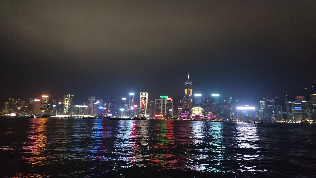 湾仔から上環まで見渡すことができ、ビルや企業の名前がライトアップされていて綺麗です。HITACHIの看板を見ると、嬉しいと同時に日本企業頑張れと思ってしまいます。