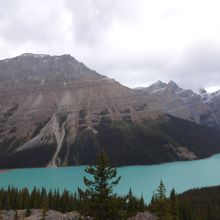 ボウ峠付近の展望台から見下ろす形になるペイトー湖は、対岸の山々と美しい湖の雄大な全景を望むことができます。湖面の色が季節や時間帯により微妙に変化するそうですが、私が訪れた日は生憎のお天気にも関わらず、大変美しいミルキーブルーでした。晴れていればきっとこの上ない美しさかと思います。1日で数か所の湖を訪れましたが、一押しの湖です。