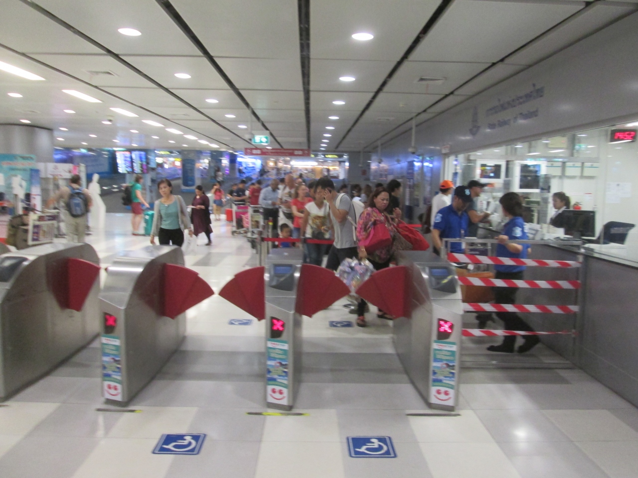 午後に空港に到着するフライトで入国審査後、すぐにスワンナプーム空港駅に到着すると券売機と有人窓口に行列が出来ていました。タイの券売機は発券手続きが日本のようにサクサク動作しないので、同じ行列の長さであれば、有人窓口の方が早く発券できます。