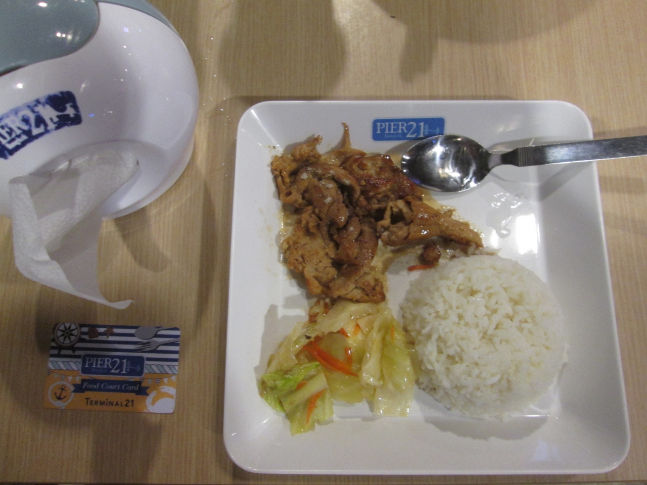 小腹が空いたらターミナル21にあるフードコートを利用します。こちらのフードコートは待ち時間がなく気軽に利用できます。お気に入りは、ポーク焼肉にライスと野菜炒めが付いたメニューで、値段は35バーツです。